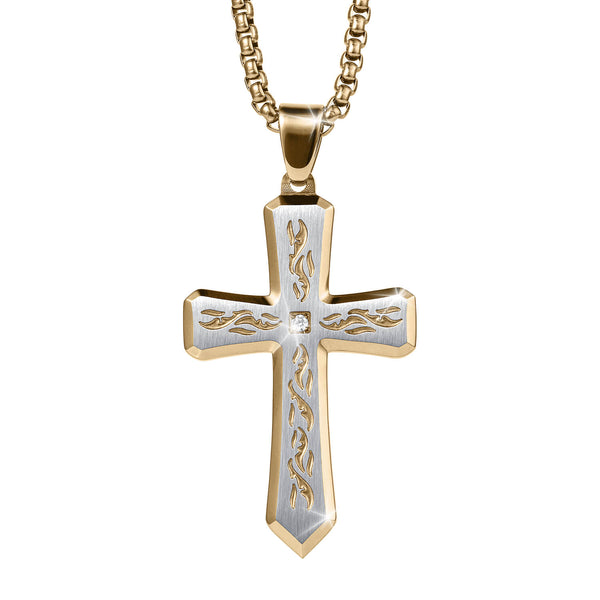 Add to any outfit with this fantastic two tone cross pendant. Crafted from premium grade stainless steel, with a two tone finish. Intricate scroll detailing leads to a glistening solitaire Diamondeau®, flawless simulated diamond, sat at the heart of this design. A classic way to display your faith and leave others admiring its beauty.