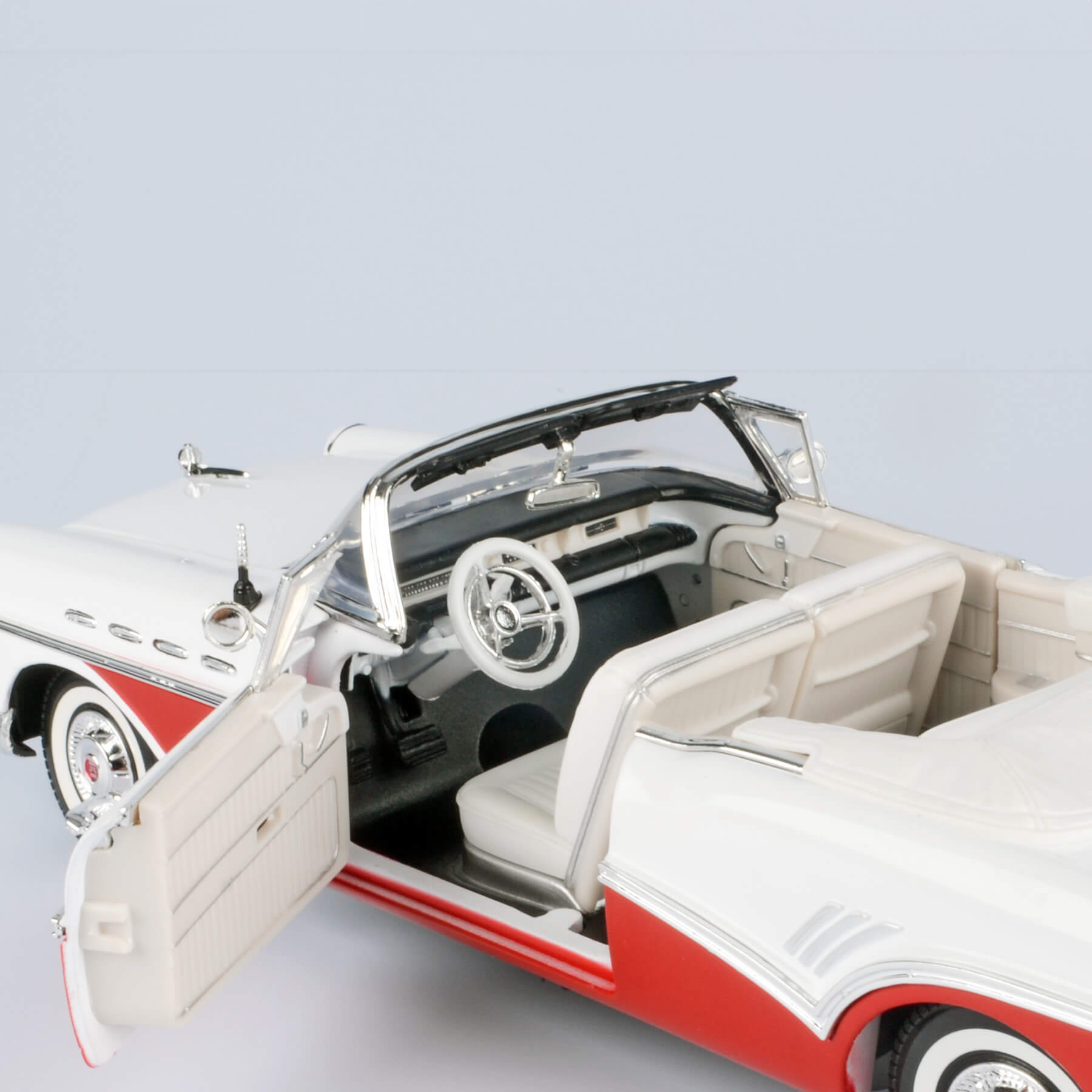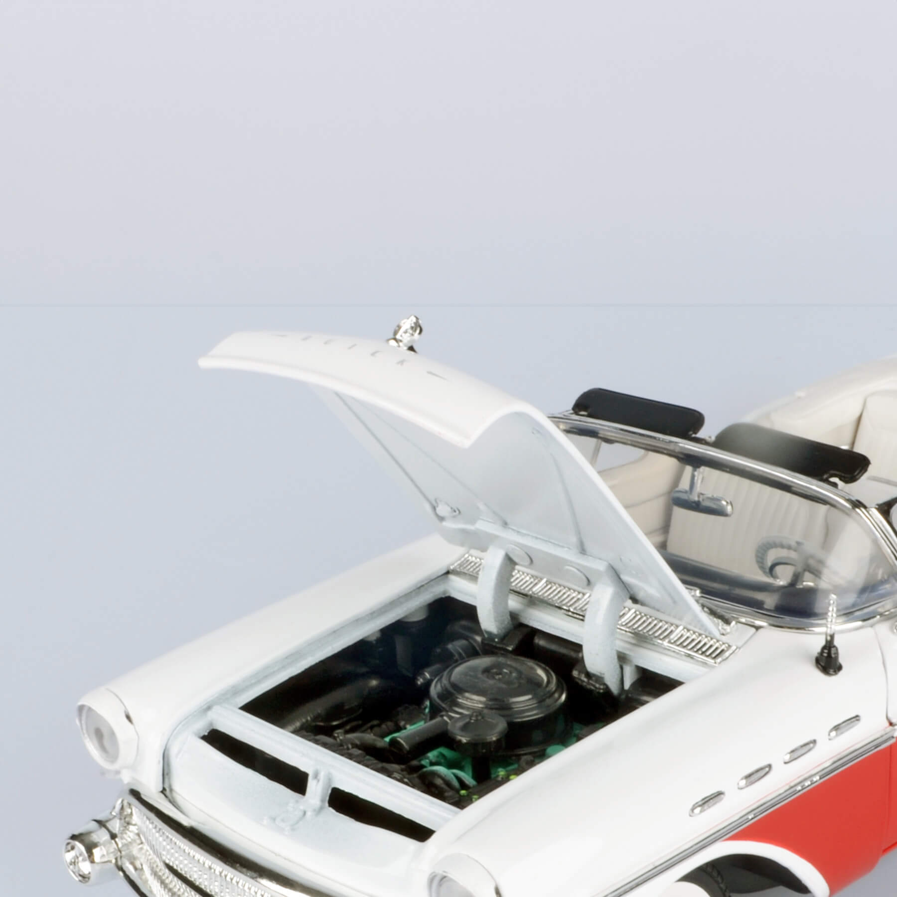 This “master” of the road has been resurrected in 1:18 scale with all the details you remember. Chromed toothy “man-eater grilles, 300HP V-8, deluxe wraparound windshield and of course the trademark chrome portholes. Every aspect of this classic car has been faithfully recreated to capture the essence of its legendary design. The vibrant two tone paint finish gleams under the light. Admire the intricate interior detailing, from the plush upholstery to finely crafted dashboard and steering wheel.