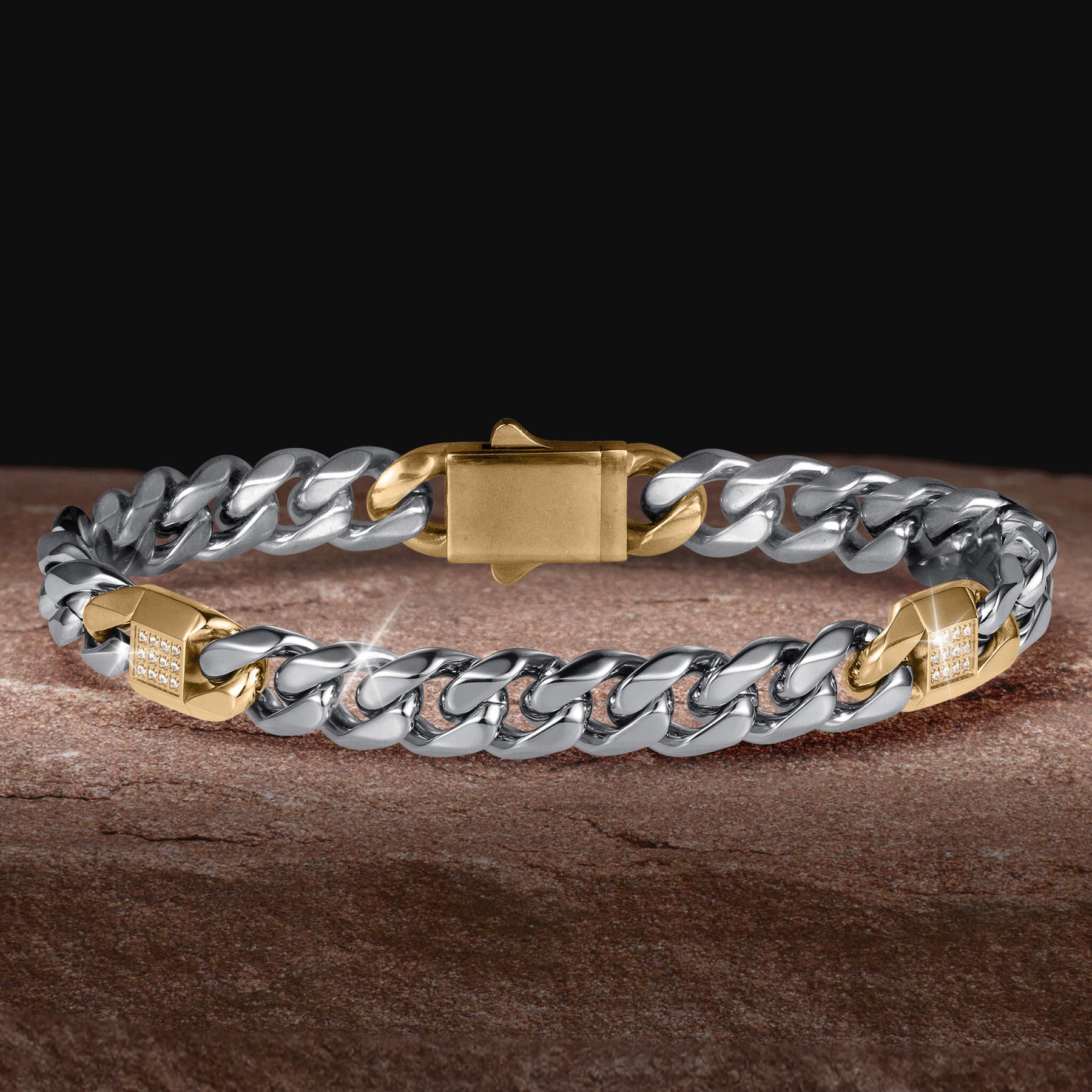 Make a statement without saying a word. This men’s two-tone stainless steel bracelet combines bold curb links with striking gold tone accents for a powerful, modern look. Precision crafted in high polish stainless steel, this piece is built for durability, weight, and everyday wear. Gold tone stations punctuate the design, set with rows of sparkling Diamondeau®, flawless simulated diamond that catch the light from every angle. The contrast of cool steel and warm gold creates a sharp, confident finish that stands out whether worn solo or layered.