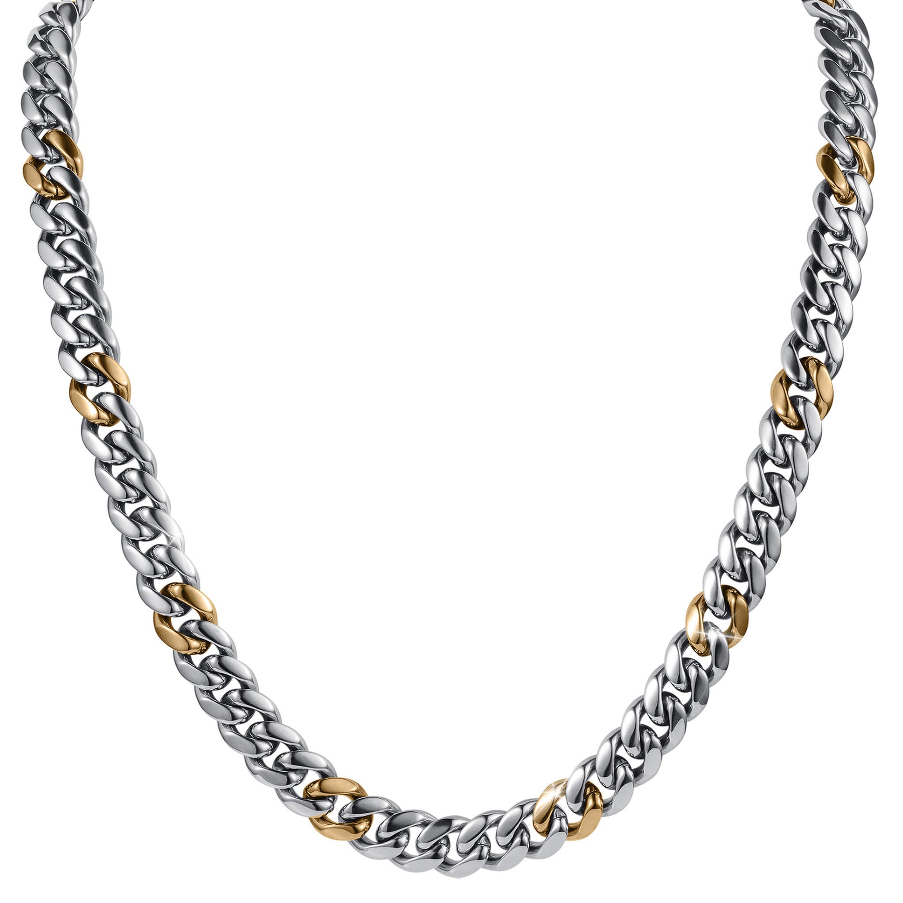 Crafted from premium stainless steel with a bold two-tone finish, this necklace is built for those who refuse to conform. The overall look is unapologetically masculine. It is heavy, sleek, and engineered with a confident presence. This necklace features a classic curb chain upgraded with modern edge: thick, high-polish links with intermittent gold accents that catch the light with every move. The clasp is designed as a focal point, set with precision-cut Diamondeau®, flawless simulated diamond that adds a sharp, unexpected flash without compromising strength. Rugged structure meets refined detail, creating a balance of durability, shine, and attitude. This necklace is made to stand out. Made to break convention.