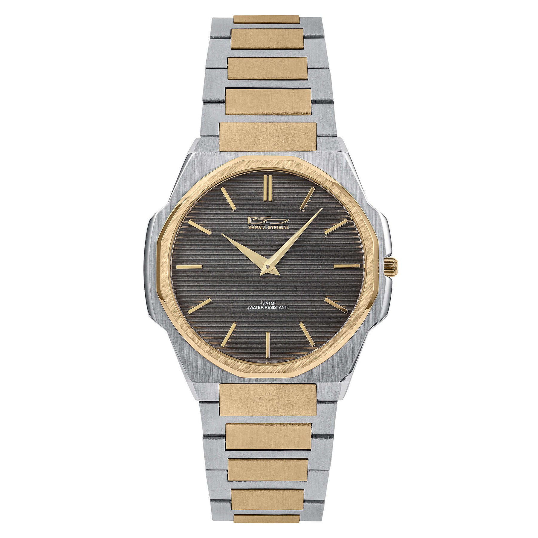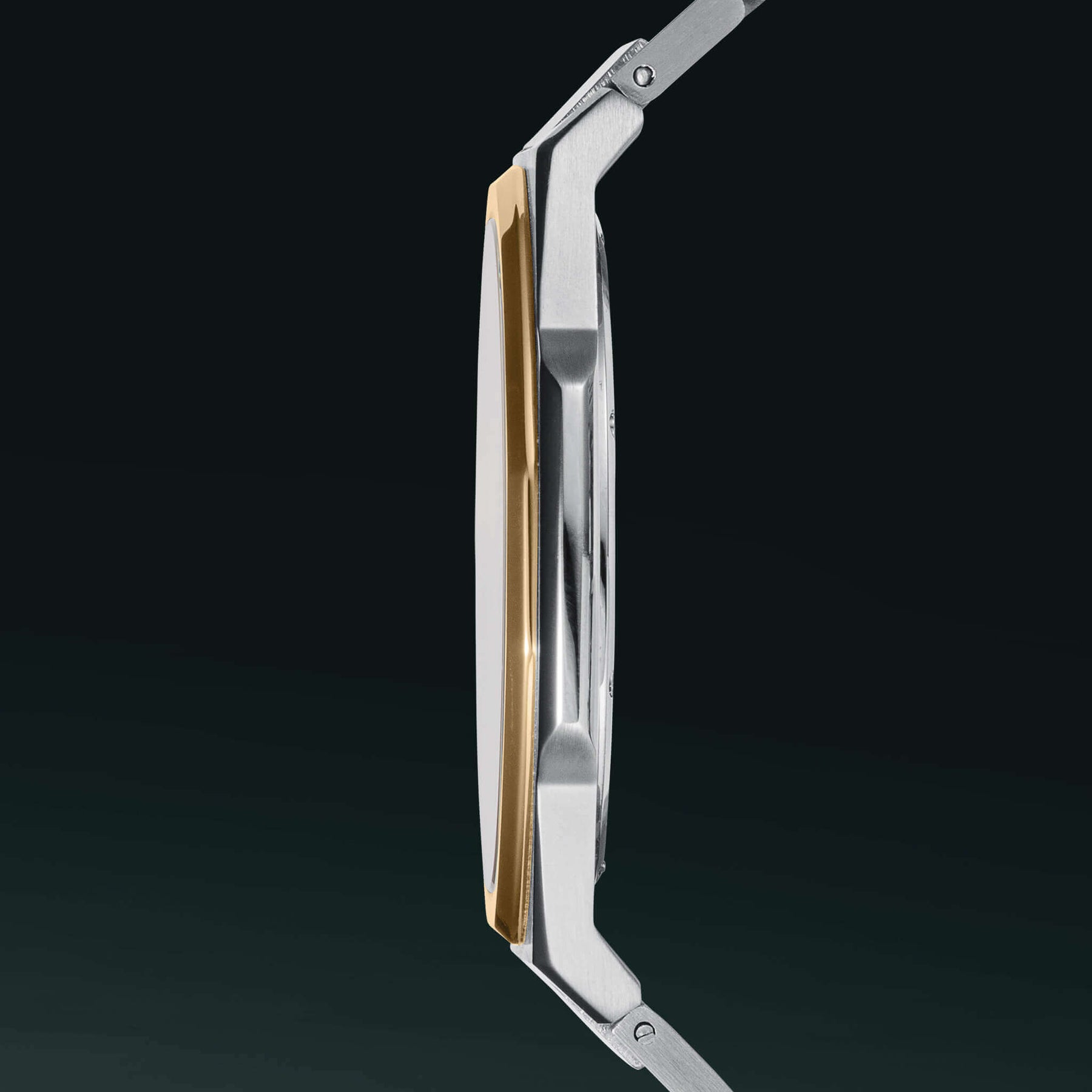 Crafted for those who appreciate refined understatement, this ultra-slim timepiece brings contemporary elegance to the wrist. Its solid steel case and matching steel strap create a seamless flow of metallic precision, elevated by warm gold accents and a textured dial that catches the light with subtle distinction. At less than a quarter of an inch thick, it offers an effortlessly sleek profile which is designed to slip beneath a cuff with ease while still making a confident visual impression. Ultra-thin watches are commanding the spotlight once again, celebrated for their comfort, versatility, and modern architectural allure. With its streamlined silhouette and meticulously considered details, this design captures the essence of that trend, making it an essential addition to any refined wardrobe.