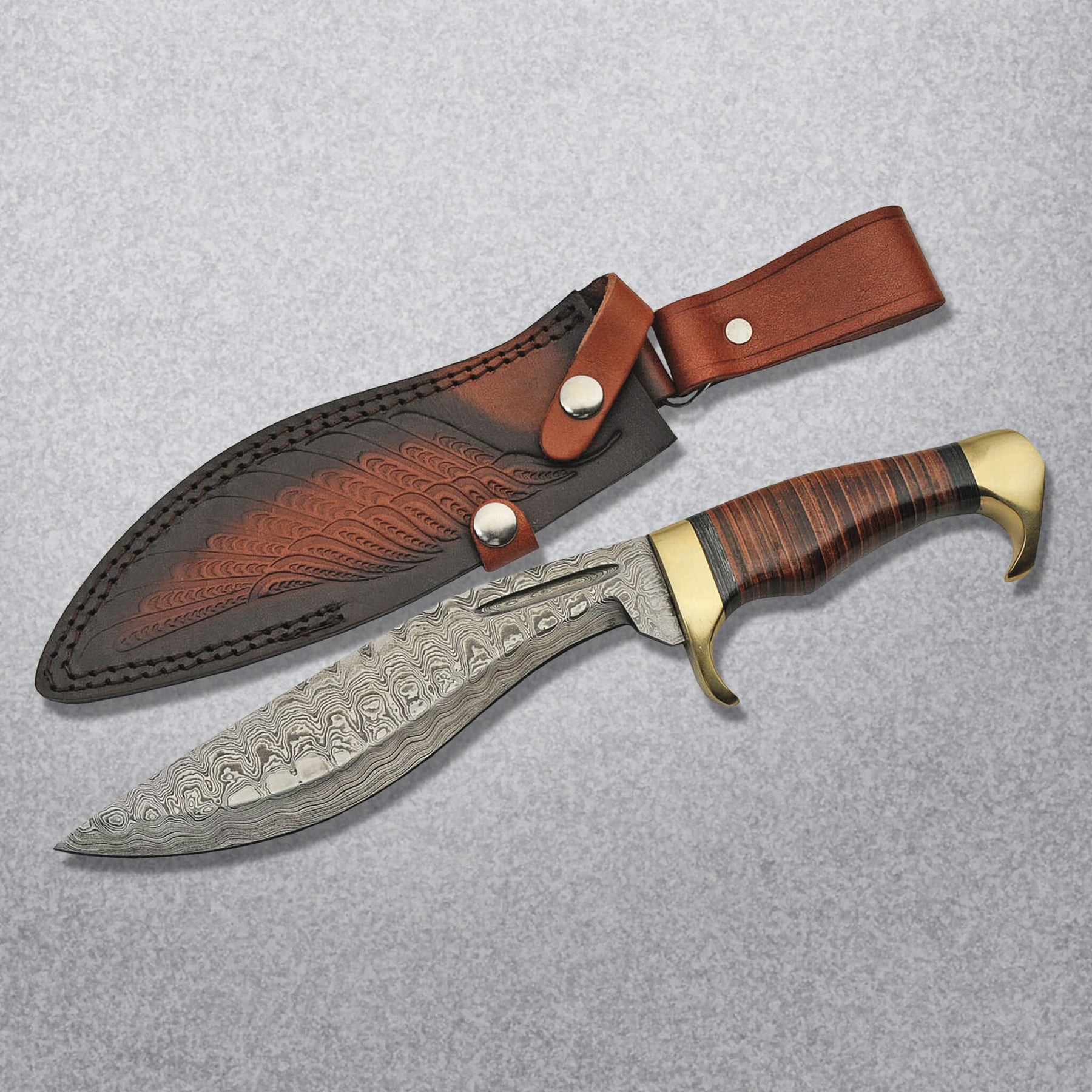For centuries, the kukri has been a symbol of duty, resilience, and craftsmanship, carried by warriors and relied upon in daily life across the Himalayan regions. This knife is crafted around that traditional form, using Damascus steel that blends strength with beauty. This 13.5” full-tang fixed blade knife is built for strength and reliability. Its forward-curved Damascus steel blade delivers exceptional toughness and a keen cutting edge, ideal for demanding outdoor tasks and field use. Designed with comfort and control in mind, the knife features a smooth leatherwrapped handle, paired with a solid brass guard and pommel. Its quality ensures strength and balance, making the knife as dependable as it is striking. Paired with a hand-stitched leather sheath, the Damascus Kukri is built to be carried, used, and respected.