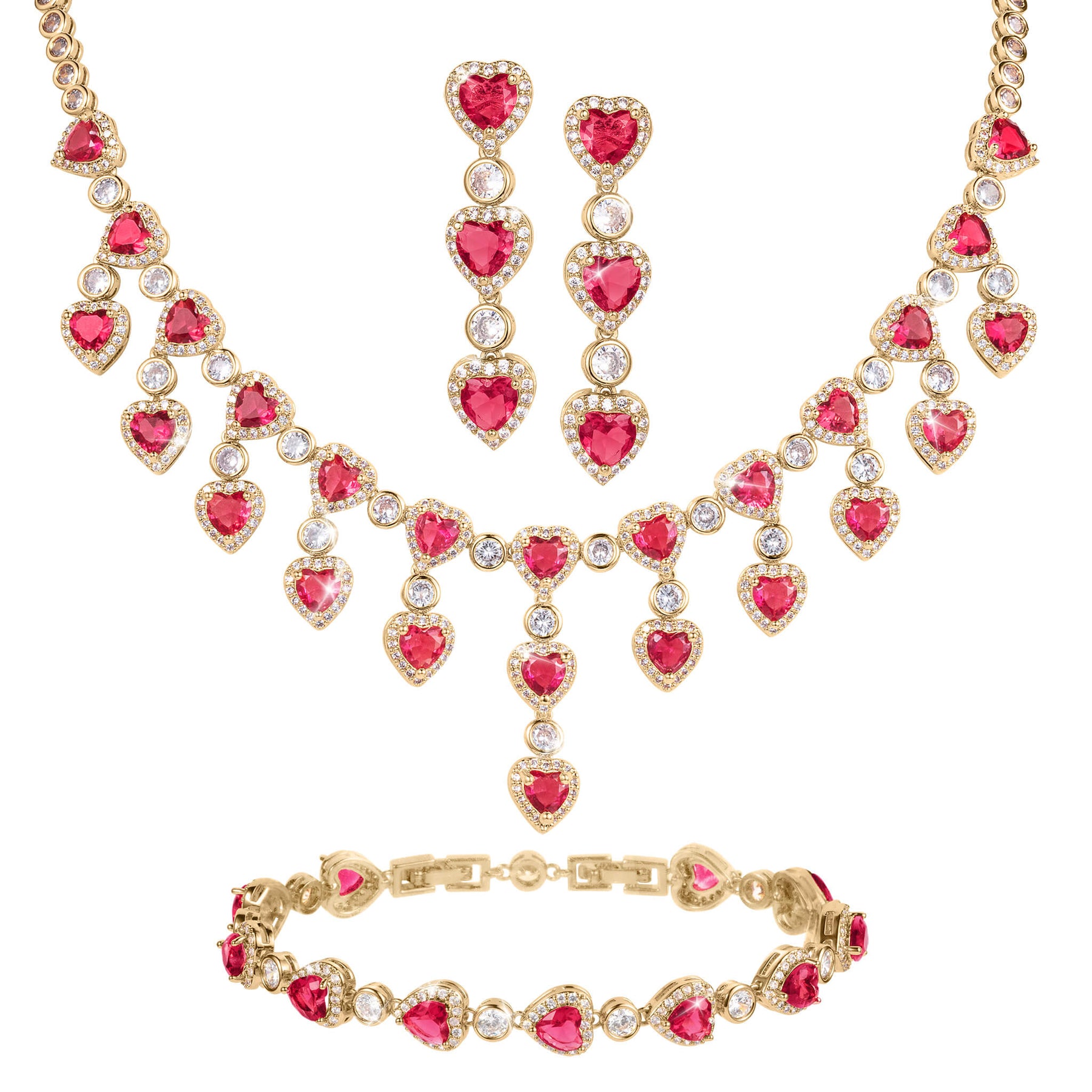 Finished in the warm glow of yellow gold, this collection radiates timeless sophistication. The heart-shaped Diamondeau®, flawless simulated diamond, shimmer with rich scarlet tones, perfectly complemented by delicate clear accents that catch and reflect the light from every angle. The heart shape has carried deep meaning for centuries; an enduring symbol of devotion since the Middle Ages, when it first appeared in art to represent spiritual and romantic love. Crafted with care and attention, each piece tells a story of love that transcends time. Perfect for romantic evenings, special celebrations, or as a luxurious everyday statement. It adds a touch of timeless romance to every occasion.