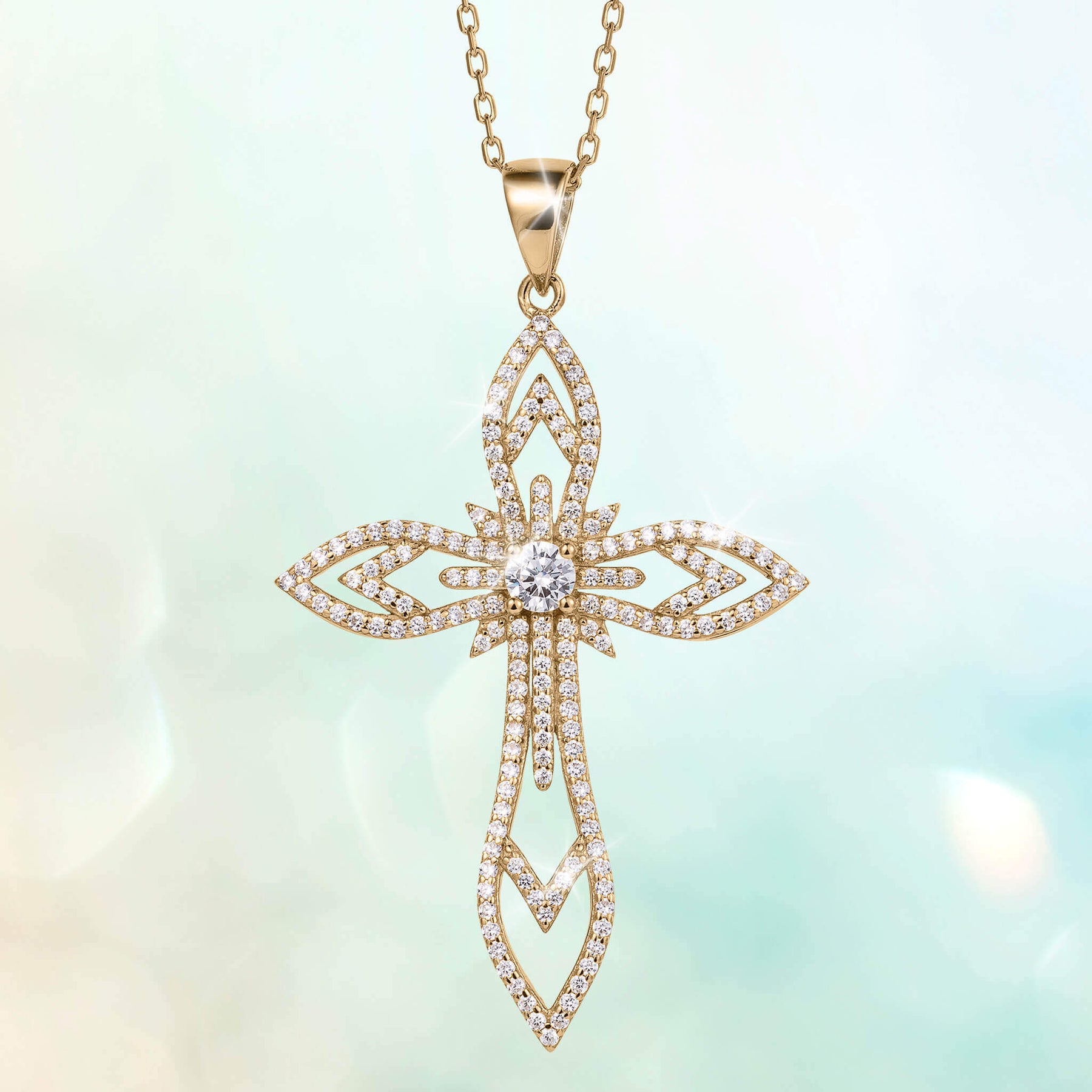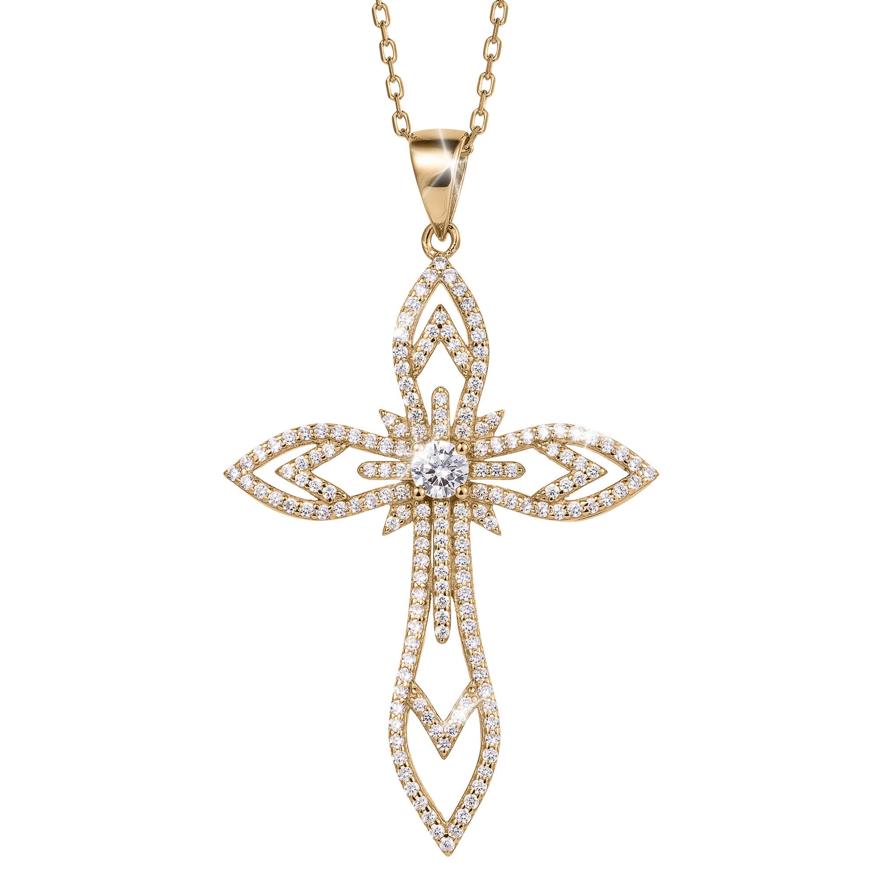 Radiant and refined, this pendant features an intricate openwork cross design that feels both airy and luminous. Dozens of sparkling Diamondeau®, flawless simulated diamond trace every curve and contour, while a brilliant center stone draws the eye with celestial brilliance. Crafted in sterling silver and finished in warm yellow gold, it balances elegance and shimmer in perfect harmony. This is an exquisite piece that glows with every movement. Wear it whenever you want to bring a touch of grace and brilliance to your day.