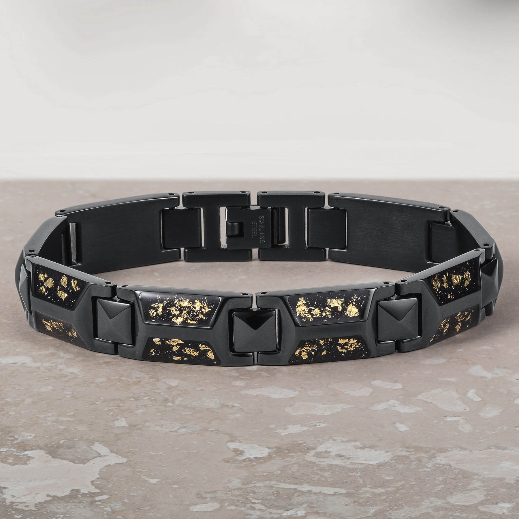 This beautiful piece captures the quiet power of a light that refuses to fade. Deep black tones cradle shimmering gold, like embers glowing in the stillness of night. The bracelet is crafted from stainless steel, finish in rich IP black and adorned with genuine 14K gold leaf. It is a fusion of strength and radiance. Created for those who find their strength in stillness.