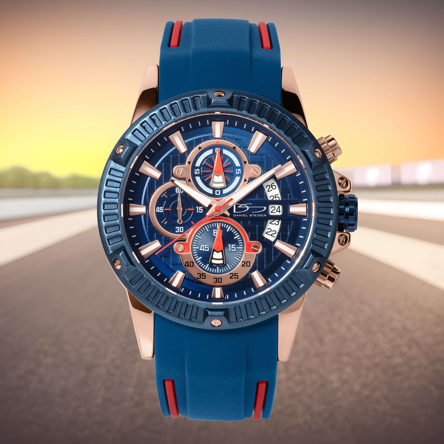 This men's sport’s watch will not only keep you on time, it also looks good too! The textured black or navy dial features 3 sub dials for 1/10th seconds, minutes and seconds, along with a useful date window. A grooved bezel with screw detail and a comfortable silicone band in black or navy with contrasting baby blue or racing red trim perfectly combines function and style.