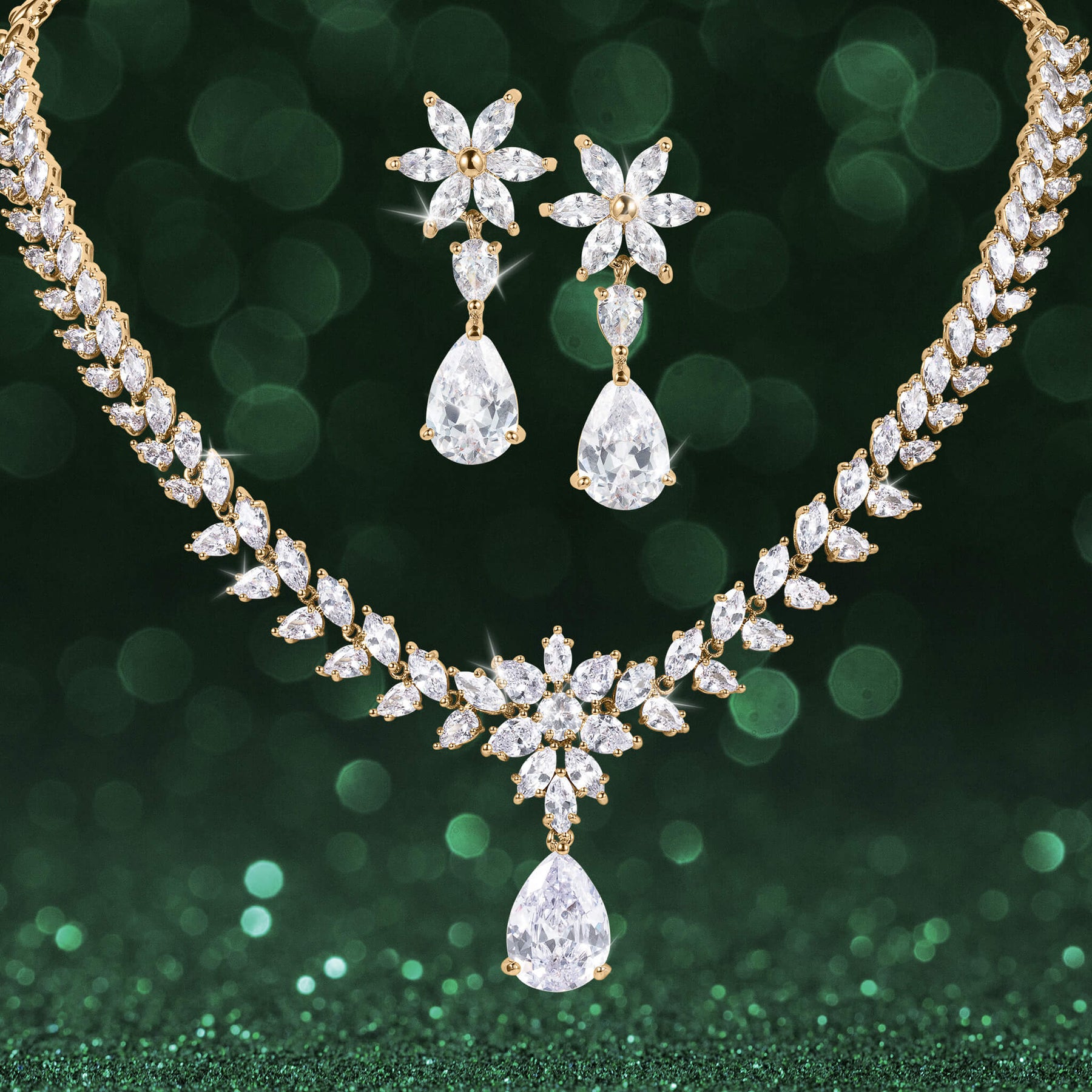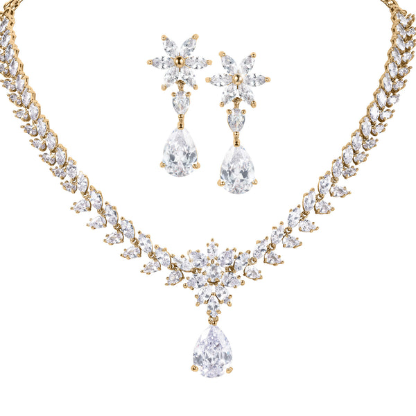 Indulge in the luxury of this stunning ladies set, where timeless elegance meets contemporary glamor. This finely crafted necklace and matching earrings are lavishly finished in radiant yellow gold, offering a warm, sophisticated glow that complements any ensemble. The design features a dazzling array of pear, round and marquise cut stones, each meticulously set with ice white Diamondeau®, flawless simulated diamond, to create a harmonious display of brilliance. Whether worn together of separately, this set is designed to make a statement and leave a lasting impression.