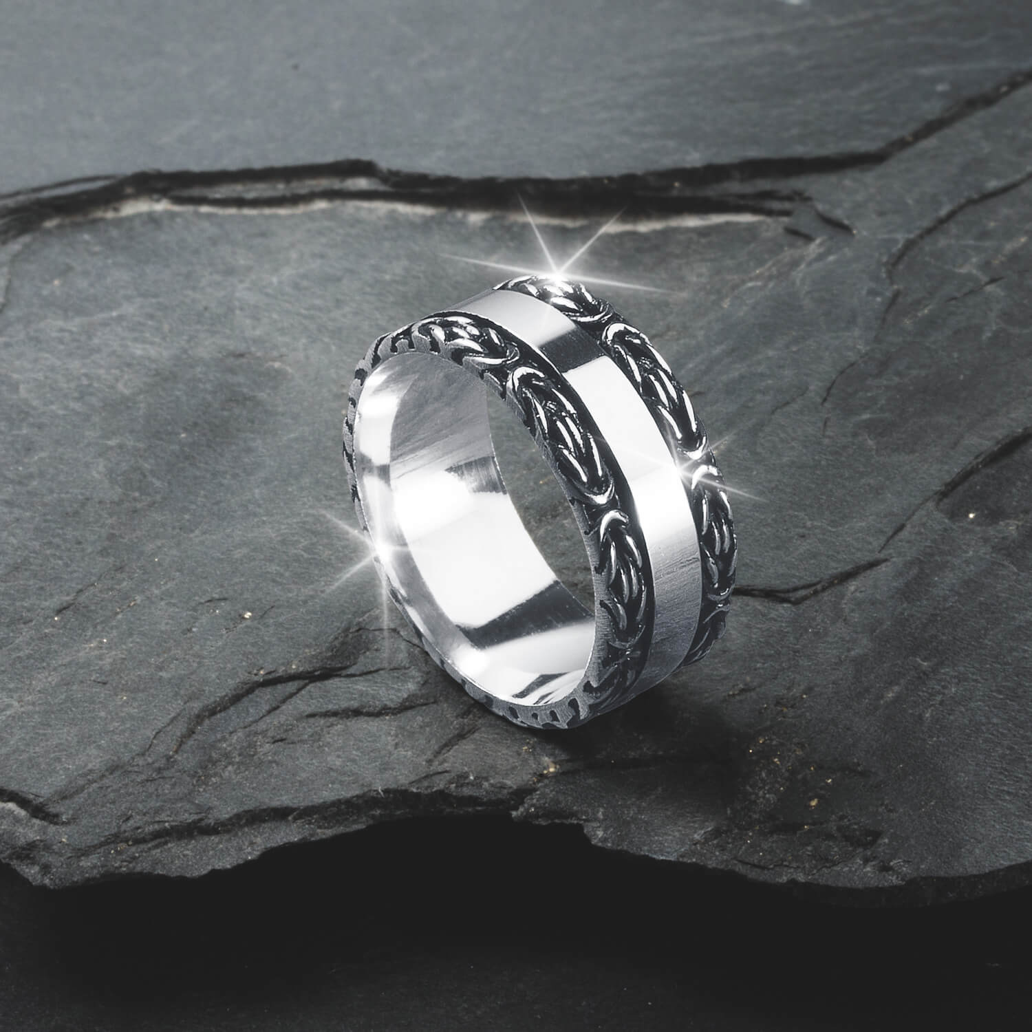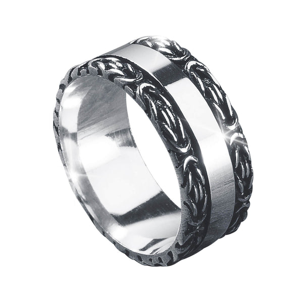 The traditional Italian Byzantine link frames this remarkable ring, this textural linking pattern is both classic and bold. A crisp polished center completes this outstanding ring, expertly crafted from sterling silver. A timeless look to wear daily.