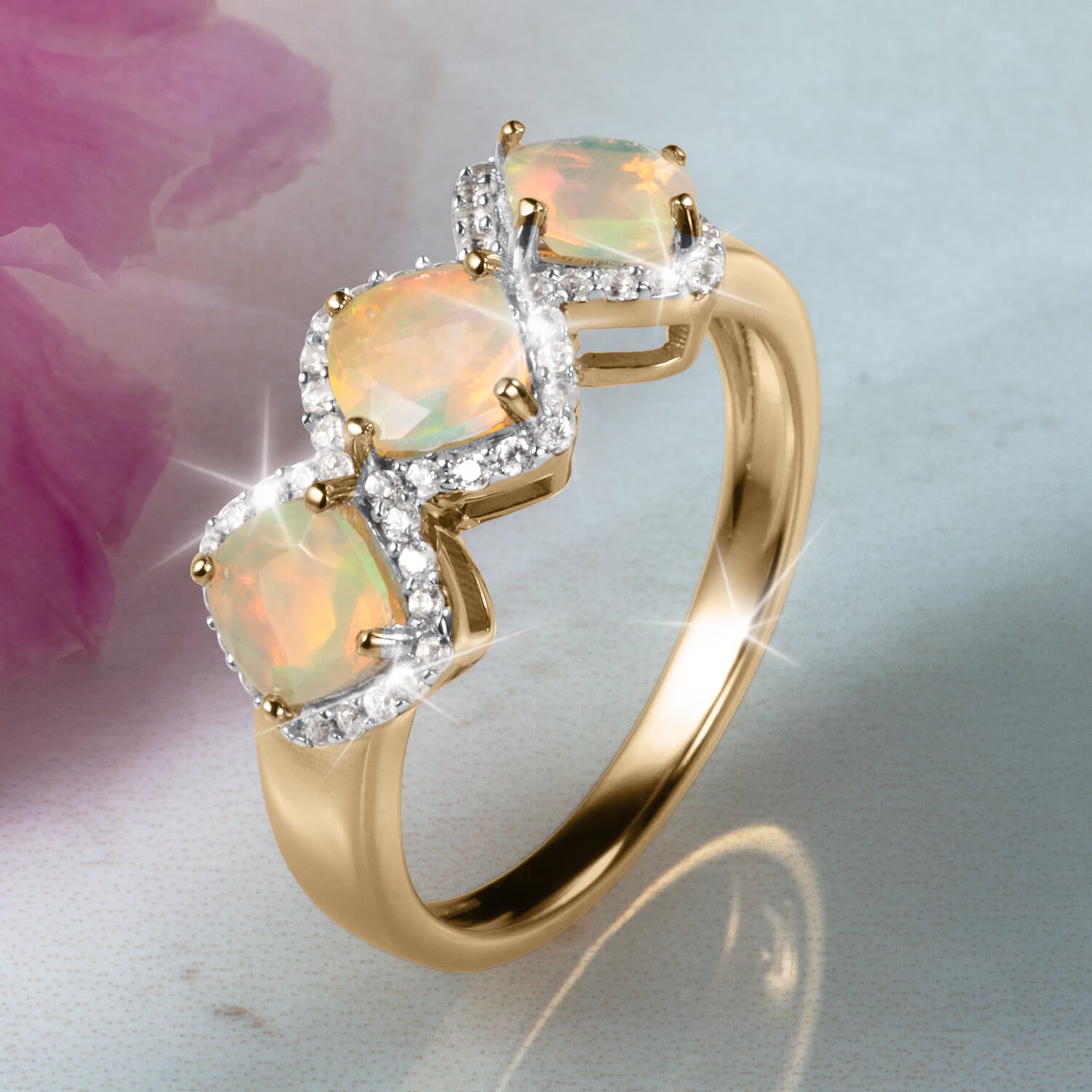 This expertly crafted sterling silver and 18k yellow gold mount has 3 cushion cut opals that provide a unique and striking appearance with their "play of color." The addition of a Diamondeau®, flawless simulated diamond halo adds additional sparkle to the piece. The ideal choice for a special occasion or as a gift.
