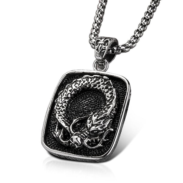Indulge yourself with this striking pendant, crafted in premium-grade solid stainless steel with an antique finish. The bold design showcases intricate detailing, creating a commanding presence. Suspended from a substantial curved link chain, this pendant is a statement piece that embodies strength and style.