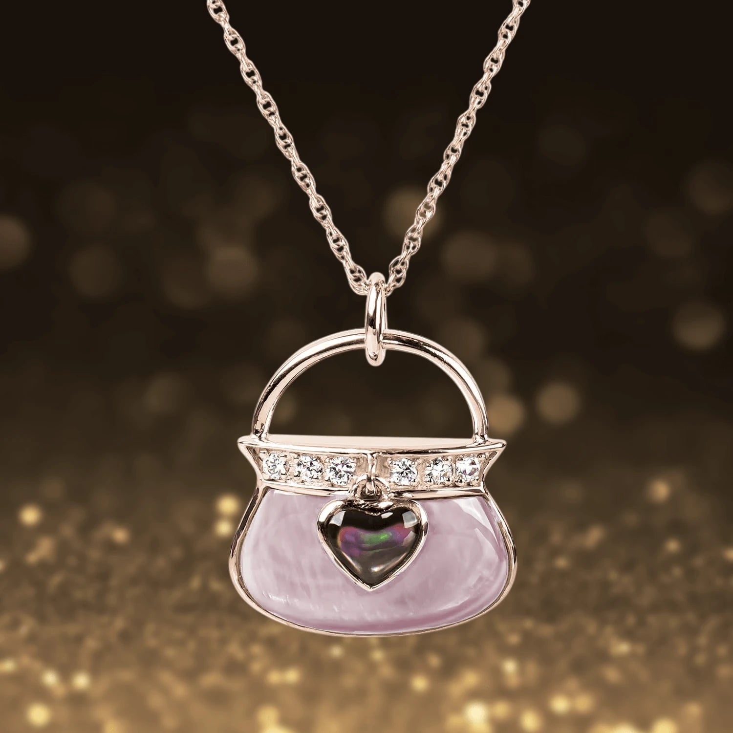 Our new Panache handbag pendants are a perfect gift and must have item. A perfect addition for the lady with a collection of designer handbags and shoes. We are sure these stunning pendants would not look out of place on any of the major shopping streets of famous fashion capitals of the world. New York, Paris, Milan. Crafted from sterling silver, finished in a choice of rose gold or yellow gold; precision set with pink mother of pearl. An articulated heart and 0.18ct Diamondeau® - flawless simulated diamond complete the look.