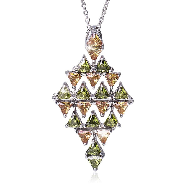 Drop pendants and earrings with a geometric or Art Deco feel to them are all the rage this season. We of course like to bring you something a little different that you cant find in just any store. We have cleverly used triangle cut Diamondeau® - flawless simulated diamonds in unusual shades of champagne and olive green as the building blocks of each piece. These flawless gems are then expertly set into mounts of the finest 925 Sterling Silver plated in contemporary Rhodium. 18 Inch pendant included with our compliments.