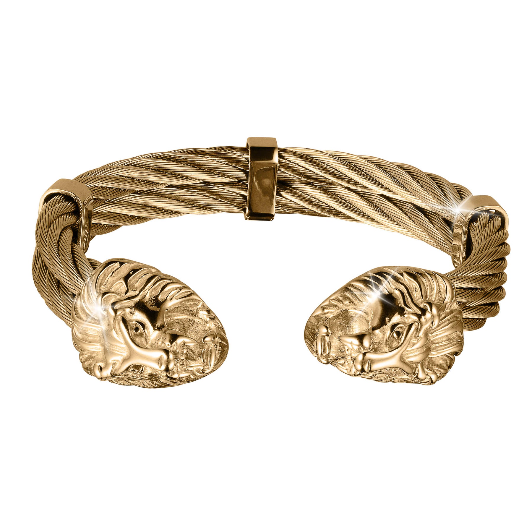 A statement piece that seamlessly blends rugged charm with timeless elegance. Crafted from durable stainless steel and finished in lustrous yellow gold. The unique double rope effect adds a touch of texture and complexity, elevating the design to a whole new level. The crowning glory of this bangle is the meticulously detailed lion head at each end, symbolizing strength, courage and regality. A bangle that surely commands attention.