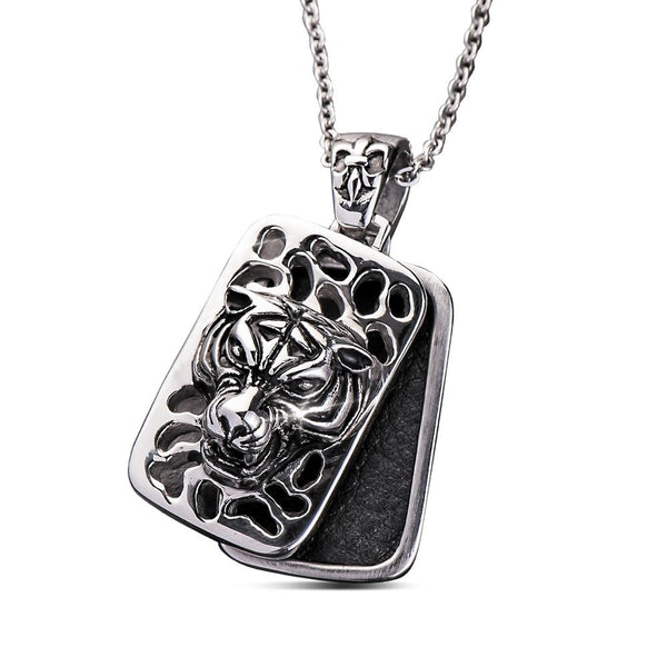 Our designer dog tag pendant combines the power of premium grade solid Stainless Steel with luxury of genuine leather. The first tag features an expertly moulded tiger that roars out at you, a perforated background gives you a glimpse of the second tag with it luxurious leather panel. 22 Inch chain included with our compliments