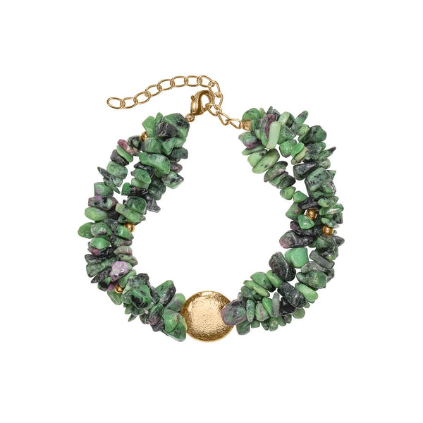 A unique colorful gemstone Ruby – Zoisite. Discovered in Tanzania at the Longibo mining district by an English prospector Tom Blevins. It is counted as one of the most colorful gemstones which can vary in color and pattern. We bring you this beautiful stone in an amazing collection. A necklace, bracelet and earring set with over 880 carats of this vibrant gem. Gold plated discs and beads are accented around this spectacular collection.