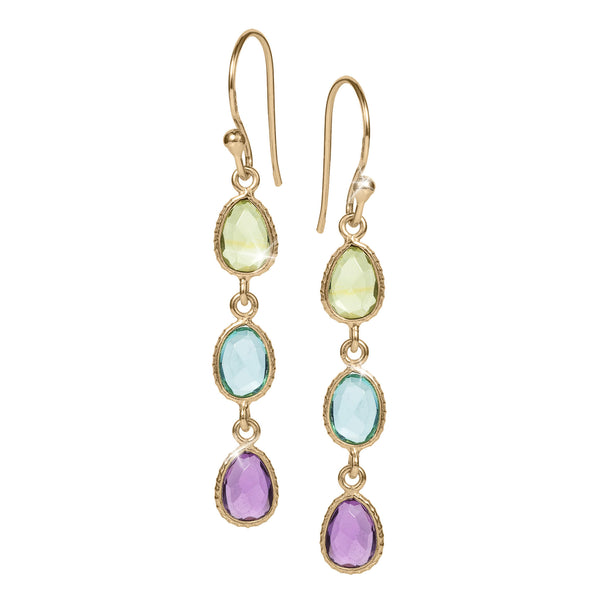 These radiant drop earrings bring together the brilliance of nature and the elegance of fine design. Crafted in sterling silver with a luminous 18k yellow gold finish, each earring features a stunning array of Lemon Quartz, Amethyst, and Blue Topaz—individually faceted and shaped to reflect an organic beauty. The gemstones are bezel set for a sleek, refined finish, with delicate engraving on each outer edge adding subtle handcrafted detail. A graceful rhythm of color and form makes these earrings a timeless celebration of radiant gemstones and refined luxury.