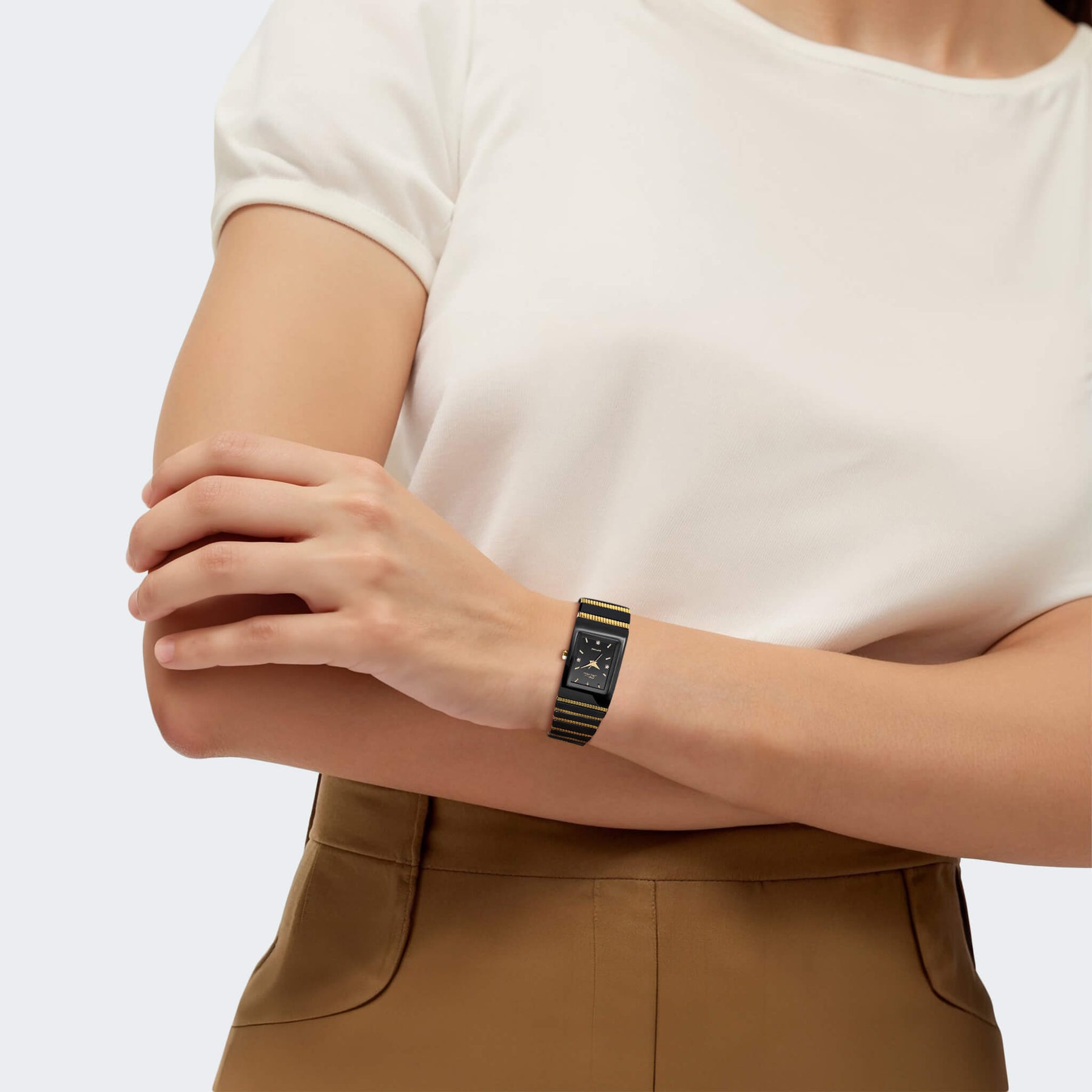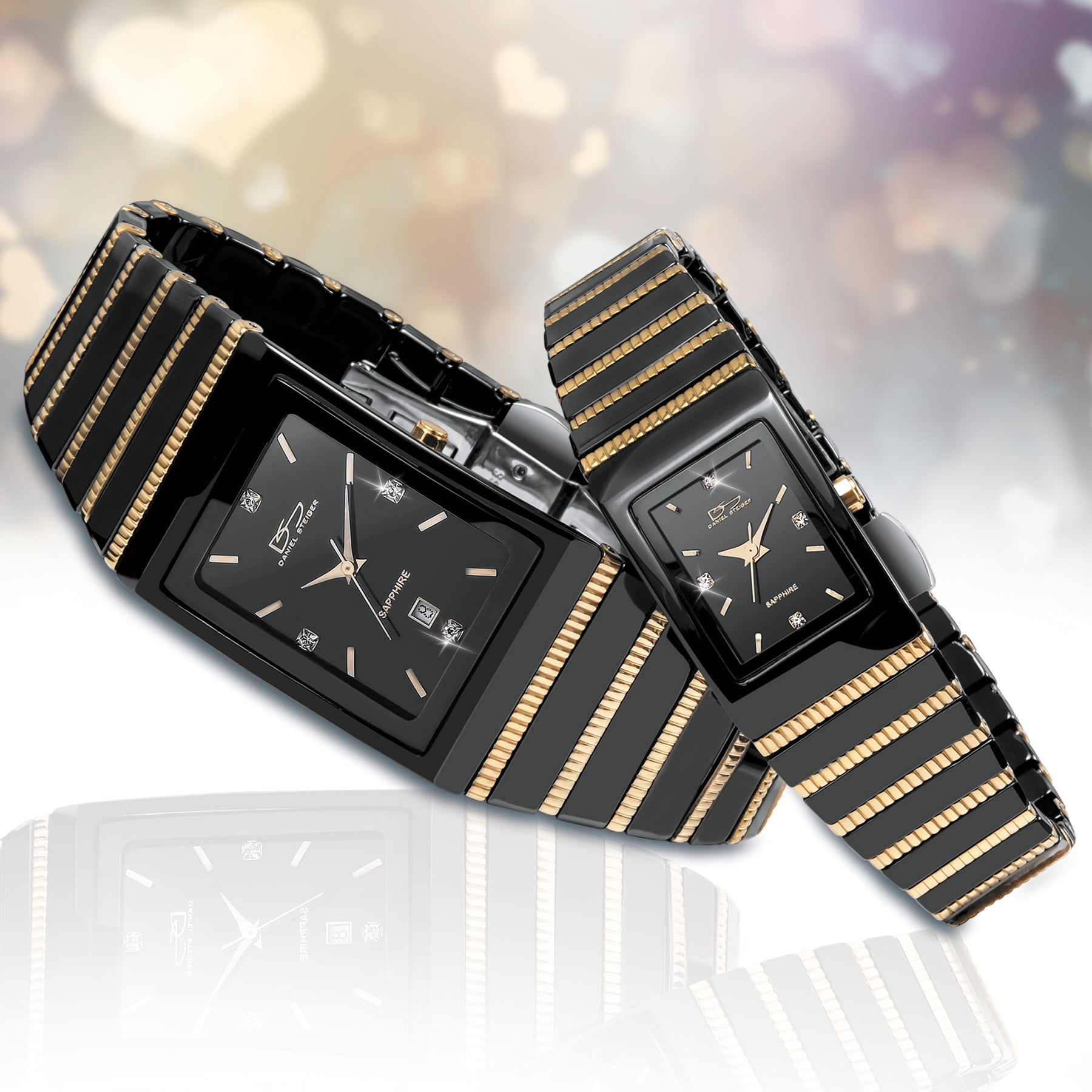 Inspired by the exotic stripes of a King Cobra our latest pair of watches is guaranteed to strike it big on the design front. The perfectly polished minimalist black ceramic case and bracelet also means you are covered as far as excellent quality goes. We of course go that extra mile by adding gold plated solid stainless steel detailing and a precision quartz date movement. A final touch of luxury is the designer dial covered with a scratch resistant sapphire crystal and studded with 4 of our flawless Diamondeau® - flawless simulated diamond. Both bracelets are fully adjustable and come with a double release butterfly buckle.