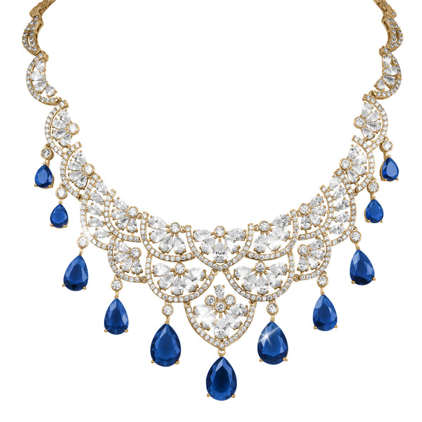 Inspired by the elegance of moonlit nights, this exquisite necklace is designed to make a lasting impression. With a harmonious blend of sparkle and depth, it brings drama and sophistication to your most cherished moments. Expertly crafted, it features dazzling white and rich blue Diamondeau®, flawless simulated diamond, each element set to shimmer with every movement. The rich gold finish adds a touch of warmth and opulence, enhancing the intricate detailing and luxurious feel. This statement necklace is perfect for weddings, evening galas, or any occasion where you want to embody grace and grandeur.