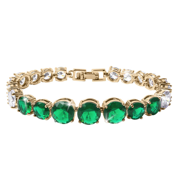 This bracelet features a timeless tennis style adding a touch of intrigue and charm. Finished in radiant yellow gold, featuring a dazzling array of shimmering Diamondeau®, flawless simulated diamond, arranged with ice white and evergreen gems to capture and reflect the light with every movement. The brilliant cut stones create a mesmerizing sparkle that will effortlessly elevate any ensemble, ensuring you make a lasting impression wherever you go. This bracelet is a true treasure that will capture hearts and create unforgettable memories.
