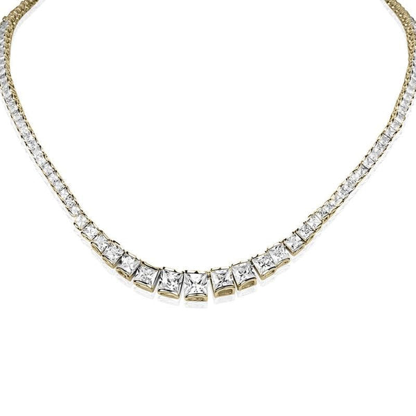 Get the look of priceless mined diamonds and platinum without the huge price ticket. Over 120 princess cut Diamondeau® - flawless simulated diamond are expertly bezel set into sterling silver. Also available finished in luxurious yellow gold, matching earrings available.