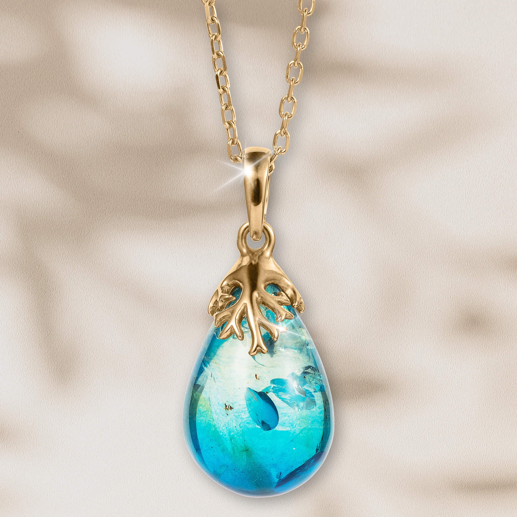 Lose yourself in the tranquil beauty of the sea with this mesmerizing pendant, where ancient earth meets modern elegance. Crafted from solid sterling silver and luxuriously plated in gleaming gold, this unique design cradles a teardrop of genuine Baltic amber — expoertly treated to display an extraordinary shade of azure blue.