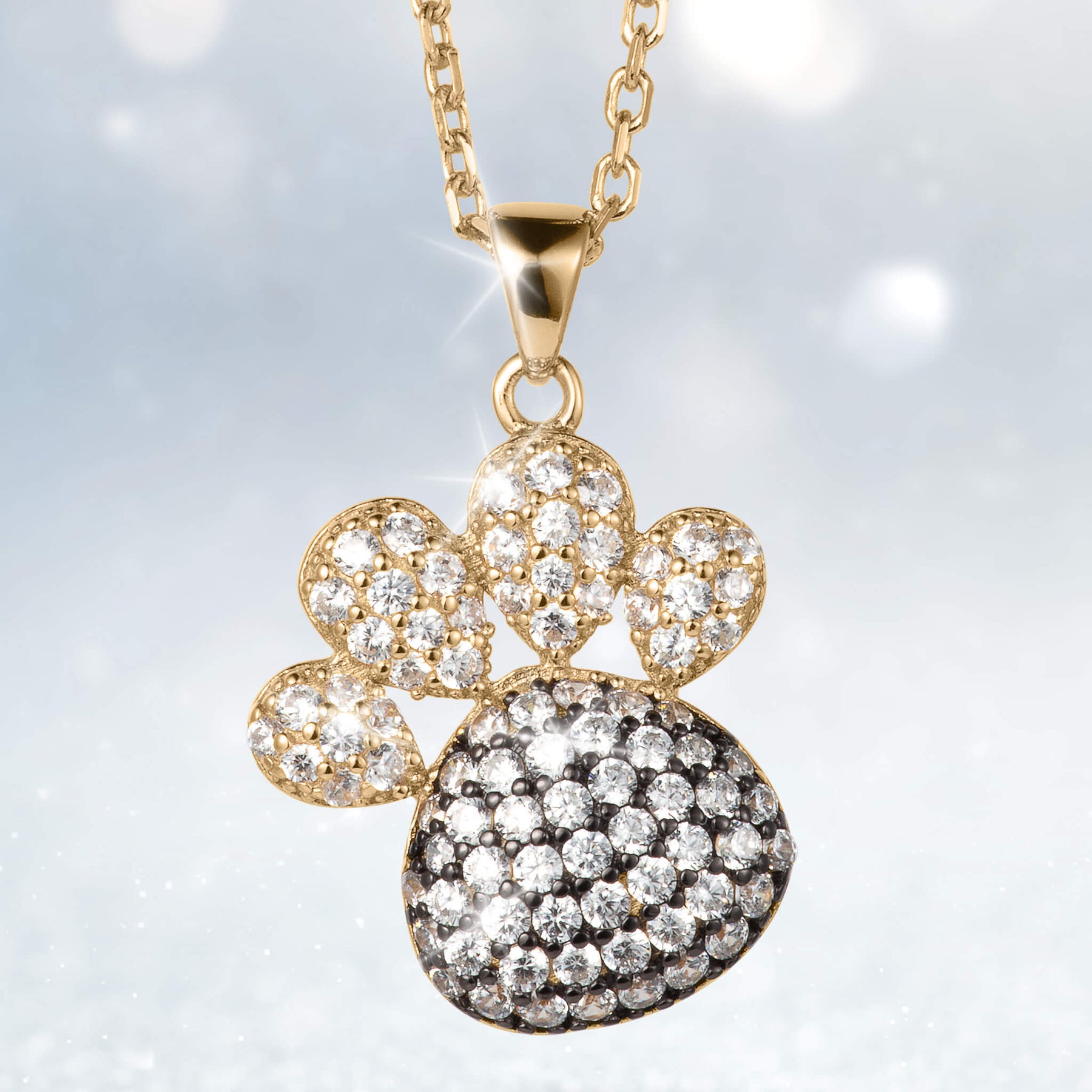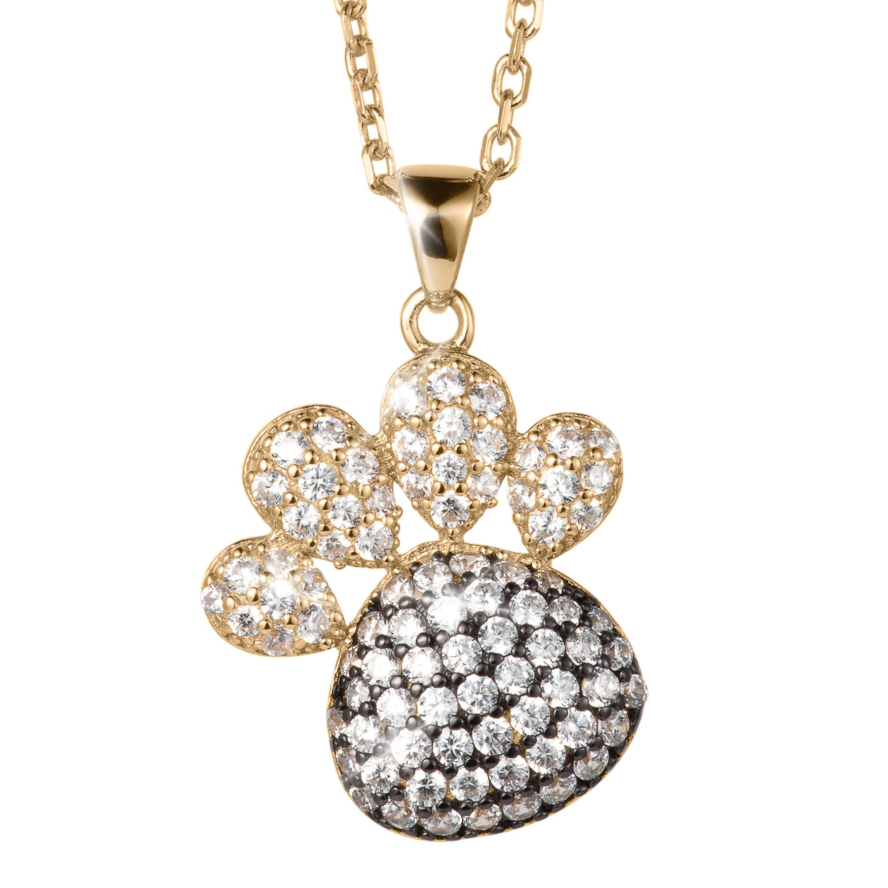 Perfect for animal lovers, this paw shaped pendant is crafted from sterling silver and finished in luxurious yellow gold, capturing the joy and loyalty of a cherished companion in sparkling detail. The paw pad glimmers with Diamondeau®, flawless simulated diamond, while the four toes twinkle with further brilliant white stones, all set in contrasting yellow gold and black tone claws. Its intricate design catches the light from every angle, adding a subtle, elegant sparkle that brightens everyday wear, yet remains refined enough to complement a special occasion. More than just a beautiful accessory, it keeps the memory and love of your furry friend close to your heart, allowing you to carry their paw print with you wherever you go. Celebrate the bond you share while enjoying a piece that effortlessly blends playful charm with timeless sophistication.