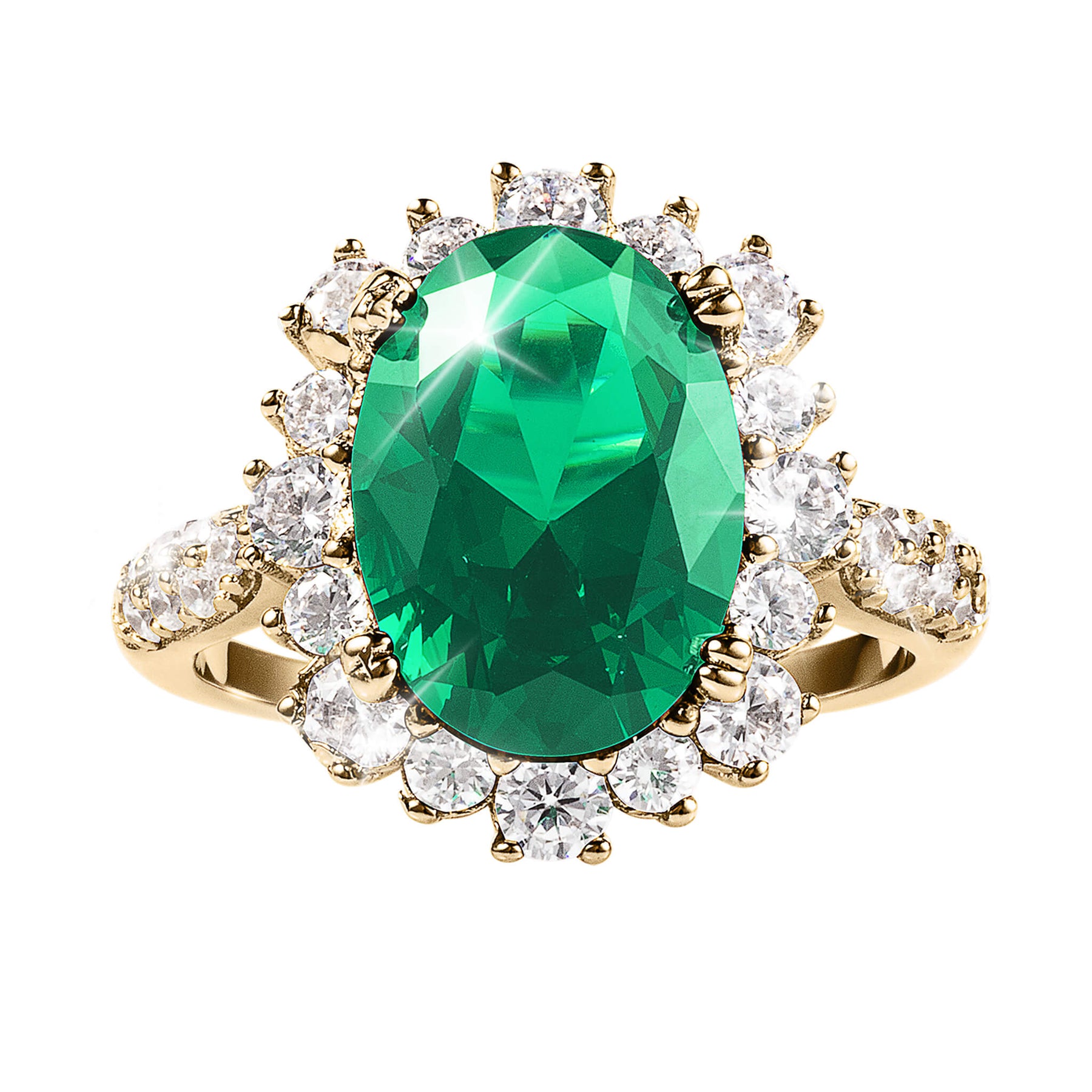 This ringis a true testament to timeless elegance and refined craftsmanship. Meticulously fashioned from sterling silver and flawlessly finished in radiant yellow gold. The ring is designed to captivate and leave a lasting impression. At the heart of each piece lies a magnificent deep green Diamondeau®, flawless simulated diamond, chosen for its vibrant allure and captivating hue, with a dazzling halo of ice white gems. This ring will undoubtedly elevate your ensemble to new heights of sophistication.