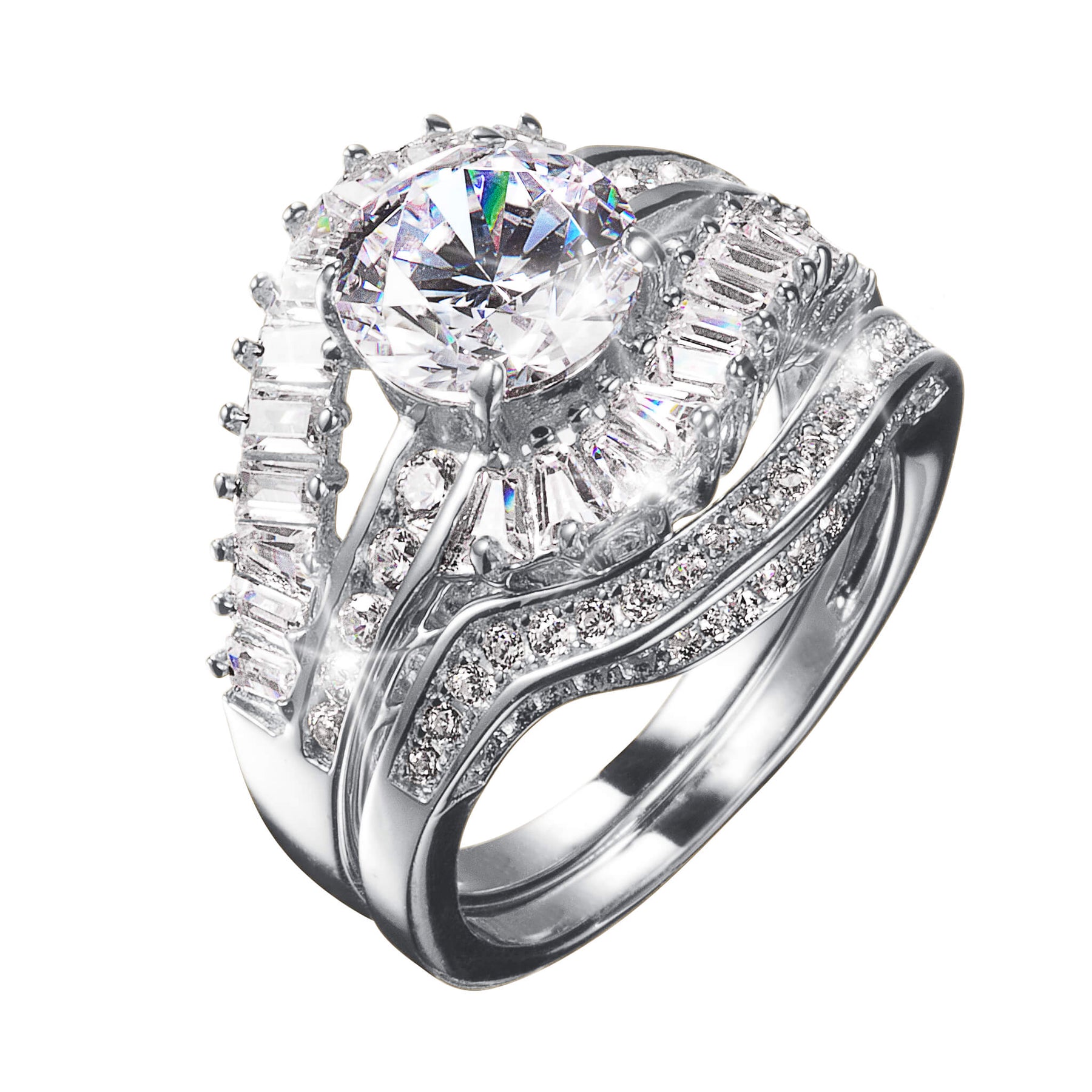 An elegant breath taking design. Featuring ice white, brilliant round and baguette cut Diamondeau®, flawless simulated diamond, set into a striking twisted sterling silver mount. The 2 piece design of this ring allows you to wear each ring either separately or together for a more dramatic look. Crafted with precision and attention to detail, this unique design is sure to impress.