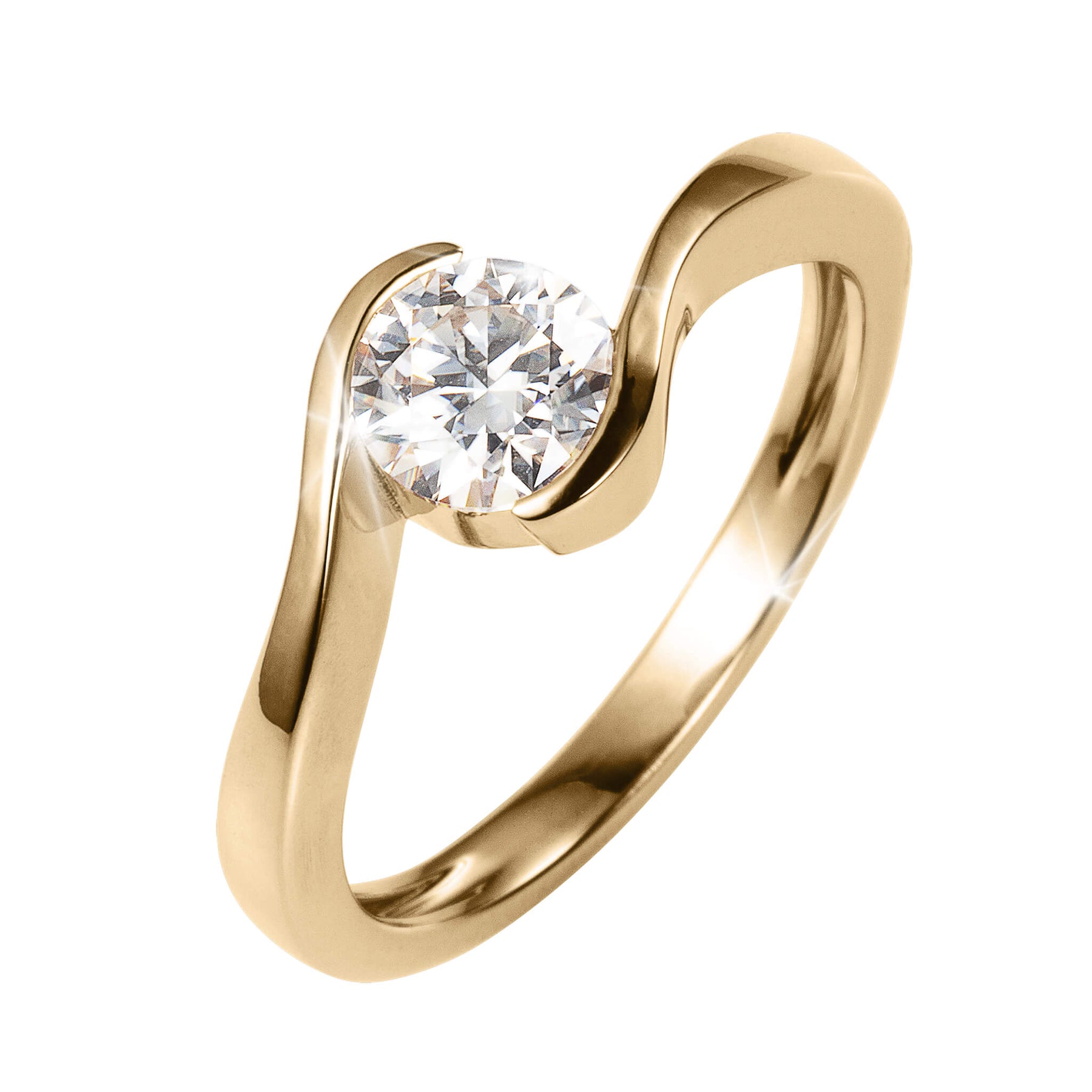 A ring of timeless beauty and grace. Crafted with meticulous attention to detail, sterling silver, finished in 18k yellow gold with a twisted mount design adds a touch of contemporary flair. The shoulders gracefully encircle the center stone, symbolizing an eternal embrace and creating an alluring focal point that draws the eye. At the heart of this stunning ring lies a solitaire Moissanite stone, a gem known for its brilliance and exceptional fire This sparkle rivals that of a diamond, captivating onlookers with its luminous beauty. A true symbol of everlasting love, making this ring the ideal gift for a celebration.