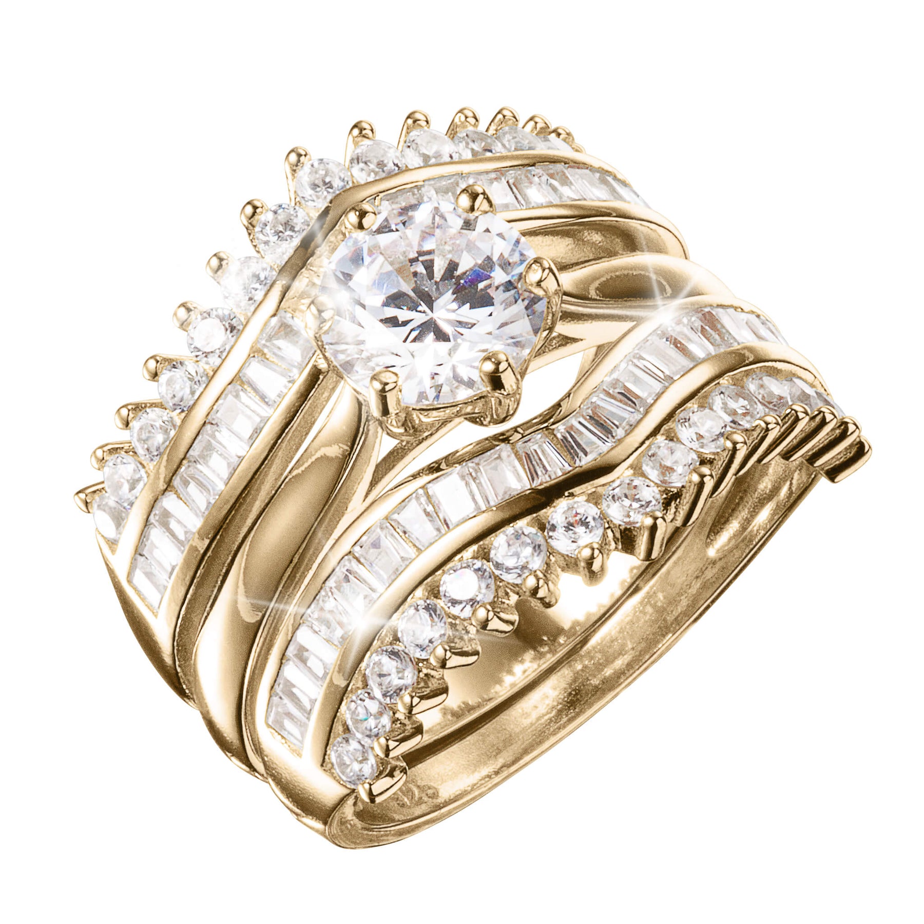 An exquisite ladies ring, expertly crafted with high quality sterling silver and finished with a luxurious gold finish. The two-piece set has a solitaire ring in the center which is simple yet elegant, designed to highlight the beauty of the central 1.67ct sparkling Diamondeau®, flawless simulated diamond. The solitaire sits perfectly in the center of two fancy bands, each one encrusted with more shimmering gems that radiate a stunning brilliance. A truly unique set that is sure to be cherished.