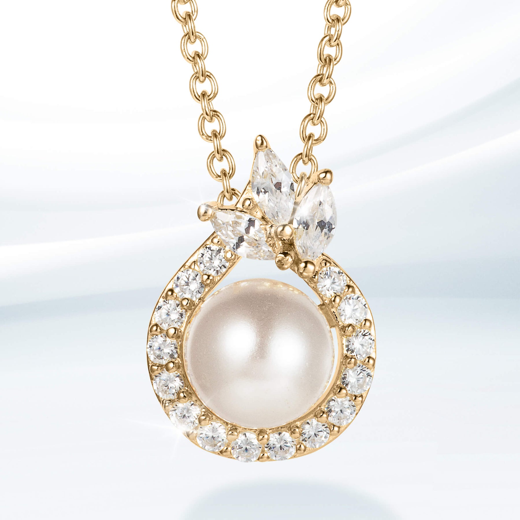 Exude timeless elegance with this exquisite earring and pendant set, designed for the woman who cherishes classic beauty. Crafted in sterling silver and finished in radiant yellow gold, each piece showcases a radiant round Pearl, encircled by a delicate halo of sparkling Diamondeau®, flawless simulated diamond. Like pure moonlight glistening on the surface of the ocean, each Pearl radiates an ethereal glow, its iridescent luster capturing the essence of grace. This soft, luminous light exudes a refined elegance that feels as timeless as the moon itself. Perfect for special occasions or adding a touch of refined beauty to everyday wear, this set will elevate any ensemble with its sophisticated charm.