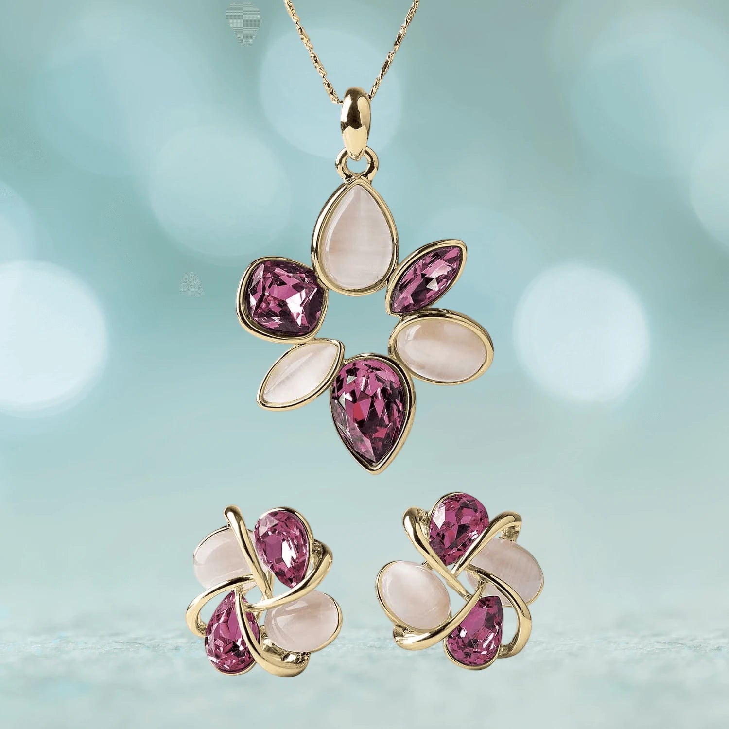 You will be sure to be completely captivated by this stunning masterpiece. The mixture of pear-shape, princess cuts, marquise and oval cuts add a vibrant intrigue. Available in luxurious rose or yellow gold plated finishes; in either necklace or earrings buy together for a great cost saving.