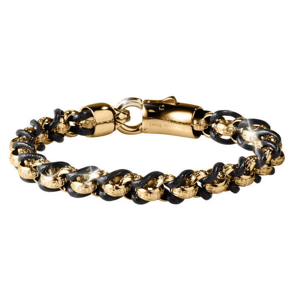 A perfect style worn solo or paired with your favorite timepiece. Stainless steel and leather entwined together with detailing on the side of each chain link, create an overall handsome, eye catching design.