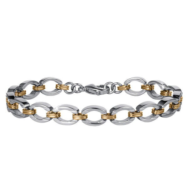 Unleash a bold style statement. Expertly designed in premium grade stainless steel, this bracelet features a dynamic two tone finish that effortlessly combines strength and sophistication. The chunky oval links, deliver an eye catching appeal that sets this collection apart. Alternating with the stainless steel links are lustrous golden links, adding a touch of luxury and contrast to the design. This bracelet is designed to make an impact.