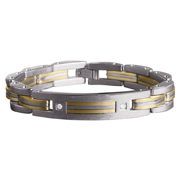 The unique combination of pure polished steel and natural white Diamonds mean this collection stands in a league of its own. Both bracelet and ring are premium solid stainless steel with a polished finish, no expense has been spared by the addition of 18k yellow gold sections for an added designer feel on both pieces. The ring is then carefully set with three natural bright white round cut Diamonds while the bracelet is set with two. A perfect gift.