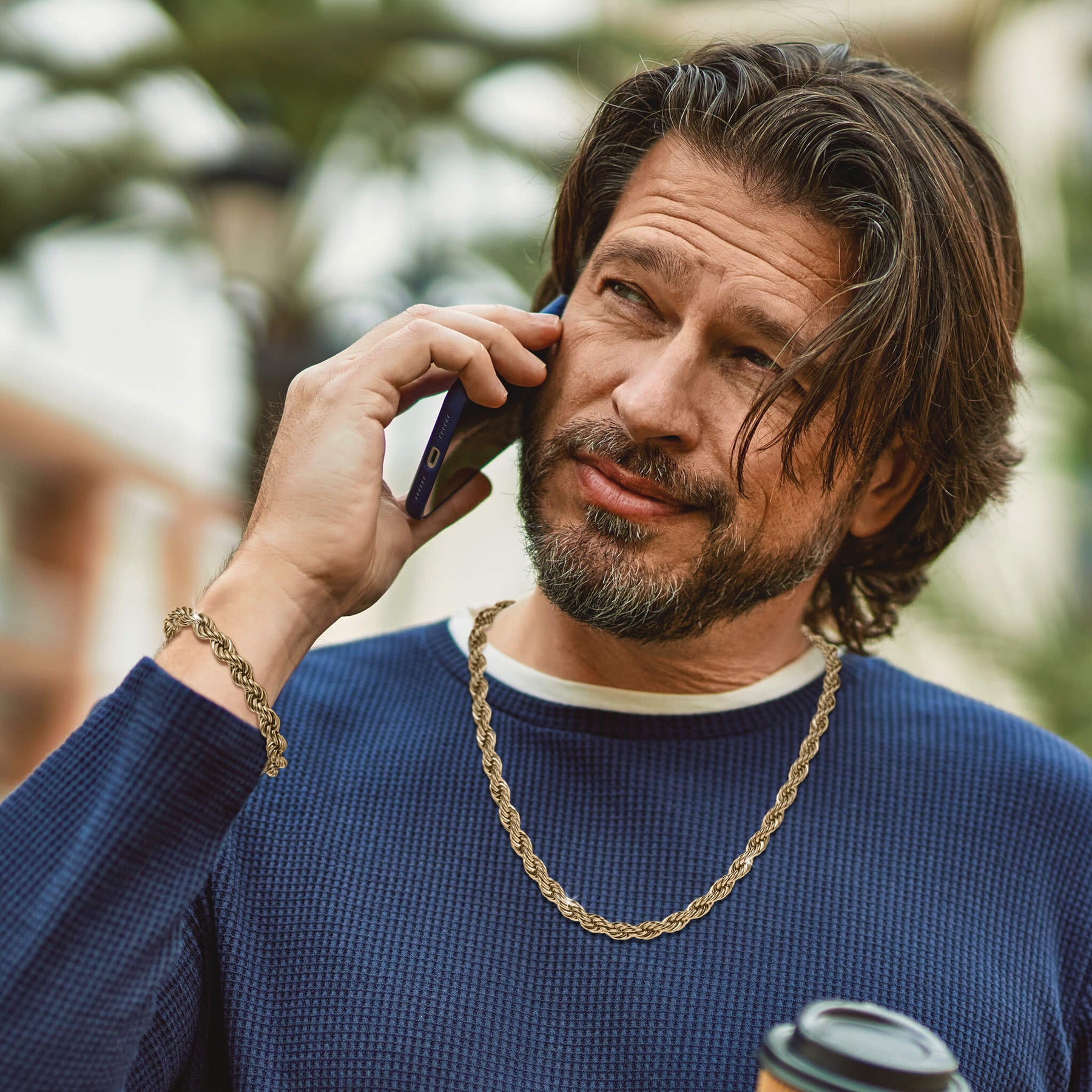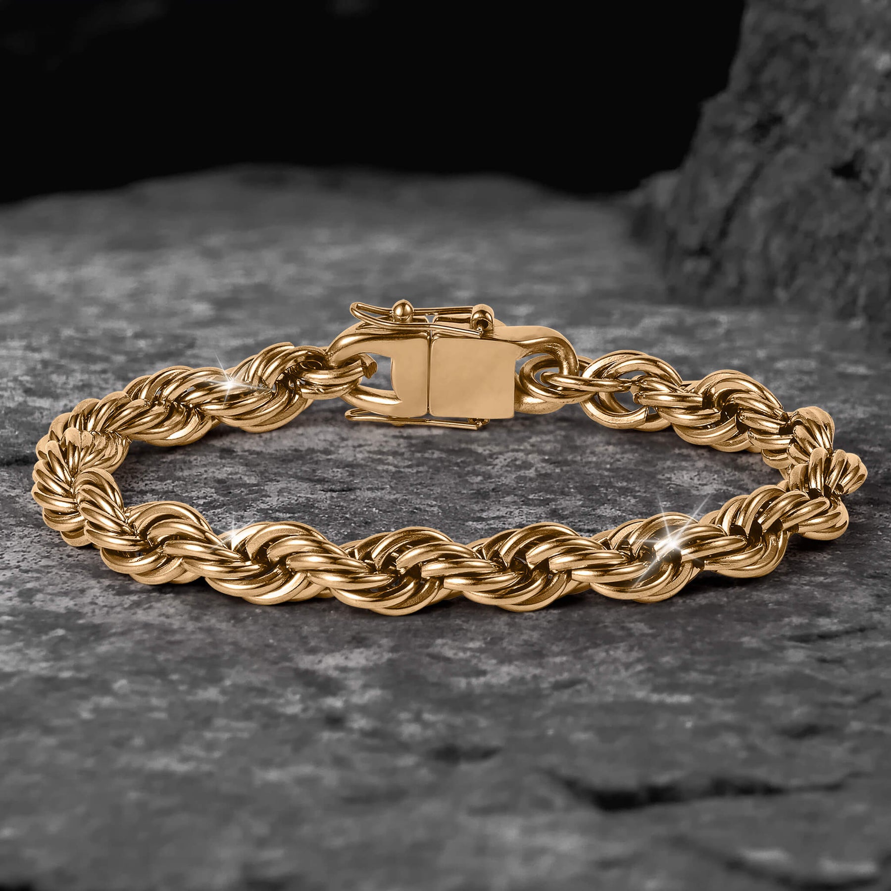 A bold statement bracelet designed for the discerning gentleman featuring an intricate rope design, meticulously crafted from premium stainless steel, finished in rich yellow gold. The twisted rope design chain provides a substantial and masculine look, perfect for adding a touch of sophistication to any outfit.