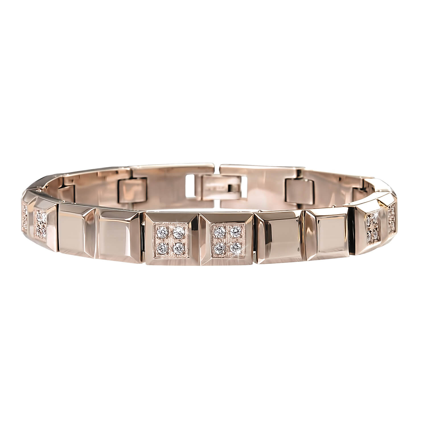 The pyramid style links of this collection feature a mirror like polished finish or are expertly set with 4 triple A grade Diamondeau® - flawless simulated diamond, for a total of 76 gems. Each piece is expertly engineered from the finest premium grade 316L solid Stainless Steel. To add the final layer of luxury that we are famous for we have fused each piece with warm 18k Rose Gold. Bracelet fits up to a 8.5 Inch wrist, rings available in sizes 9 to 14.