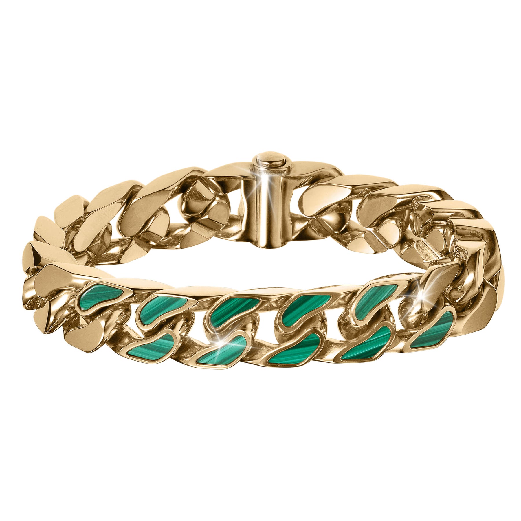 A true masterpiece of craftsmanship and style. Finely crafted from stainless steel with a yellow gold finish, the timeless, classic curb links have been a favorite of men’s jewelry for generations. The center links have been inlaid with stunning deep, green Malachite. This breath-taking stone adds an element of sophistication and flair to the classic design of this bracelet, making a statement that is truly awe – inspiring. Add a touch of boldness and individuality to your everyday.