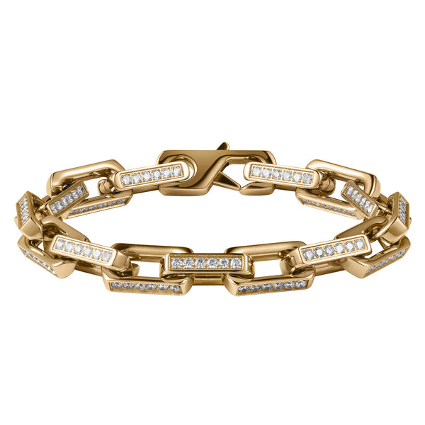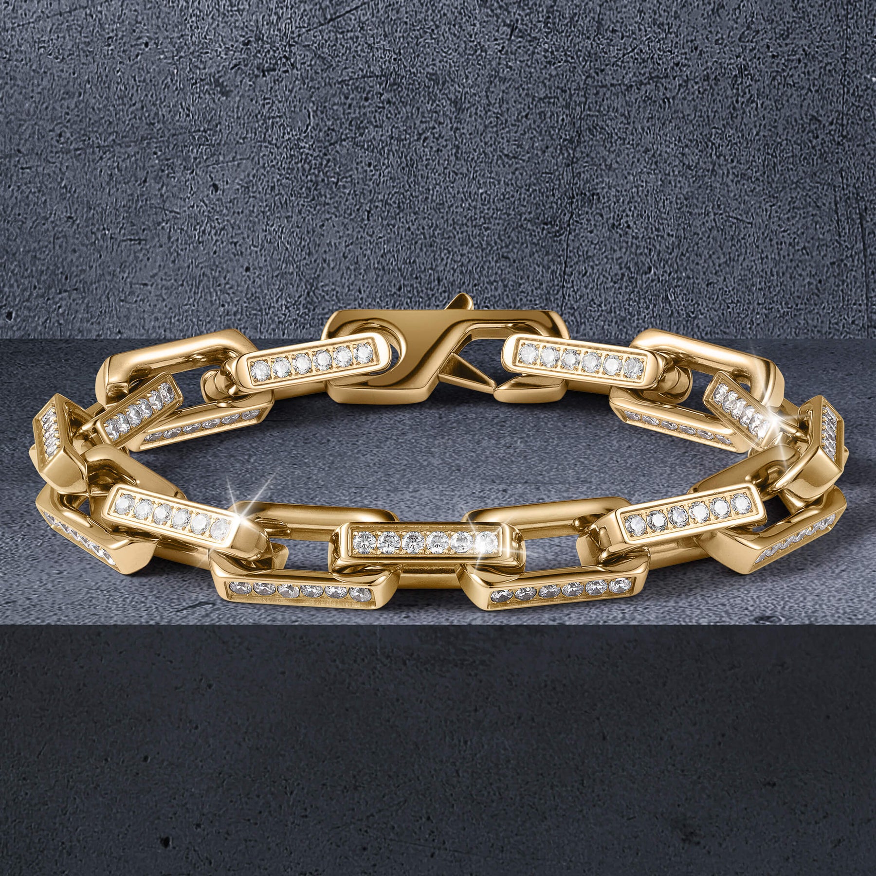 This bracelet is a statement of strength and style. The combination of stainless steel’s endurance and the opulence of yellow gold, creates a stunning contrast that exudes a commanding presence. The standout feature lies in its chunky square belcher links, meticulously designed to capture attention. Crafted from premium grade stainless steel, finished in yellow gold. Each link is adorned with precisely placed Diamondeau®, flawless simulated diamond, ensuring these gems catch and reflect light with remarkable accuracy. The ideal choice for those who seek to leave a lasting impression.