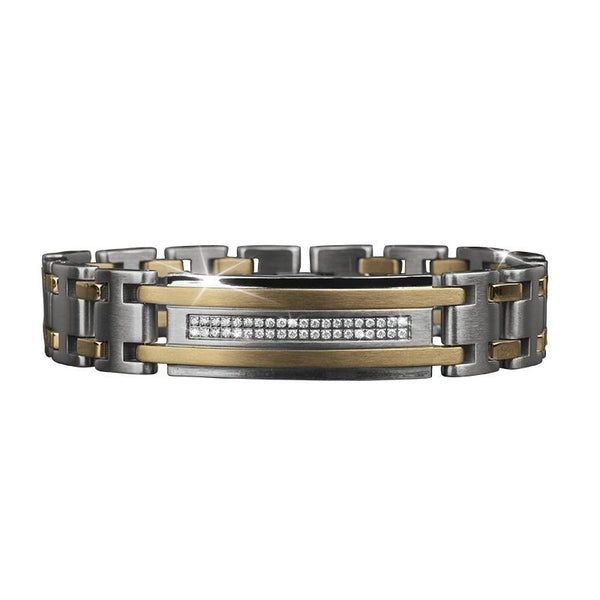 This exquisite collection has it all, premium grade stainless steel finished in yellow gold complimented by contrasting plain steel. In the heart of the bracelet is an ID plate precision set with 40 Diamondeau® - flawless simulated diamond stones for an additional luxurious feel. To finish this off is a matching ring accented with 6 Diamondeau® - flawless simulated diamond. Really unique jewelry for your wardrobe.