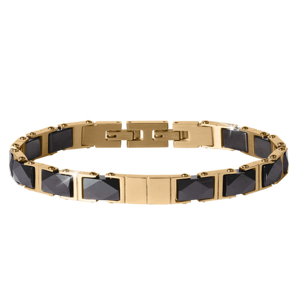 Upgrade your style with this bold and refined men’s bracelet. Crafted from durable stainless steel and finished in radiant yellow gold, this piece combines strength with sophistication. The bracelet’s sleek design is enhanced by striking black ceramic inlays set into the links. This bracelet makes a powerful statement and exudes an air of rugged elegance that effortlessly compliments your individual style