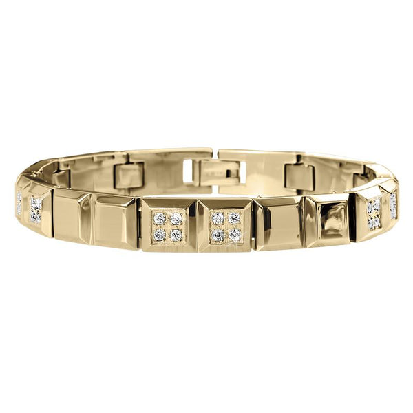 The pyramid style links of this collection feature an intermix of mirror like polished finish or expertly set 4 of our signature Diamondeau® - flawless simulated diamond, a total of 76 flawless gems in each ring. Each piece is expertly engineered from the finest premium grade stainless steel. To add the final layer of luxury we have finished each piece with golden 18k yellow gold.