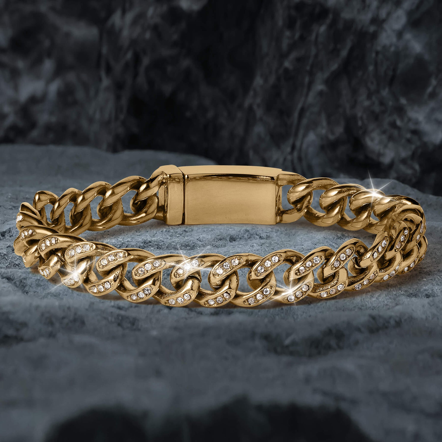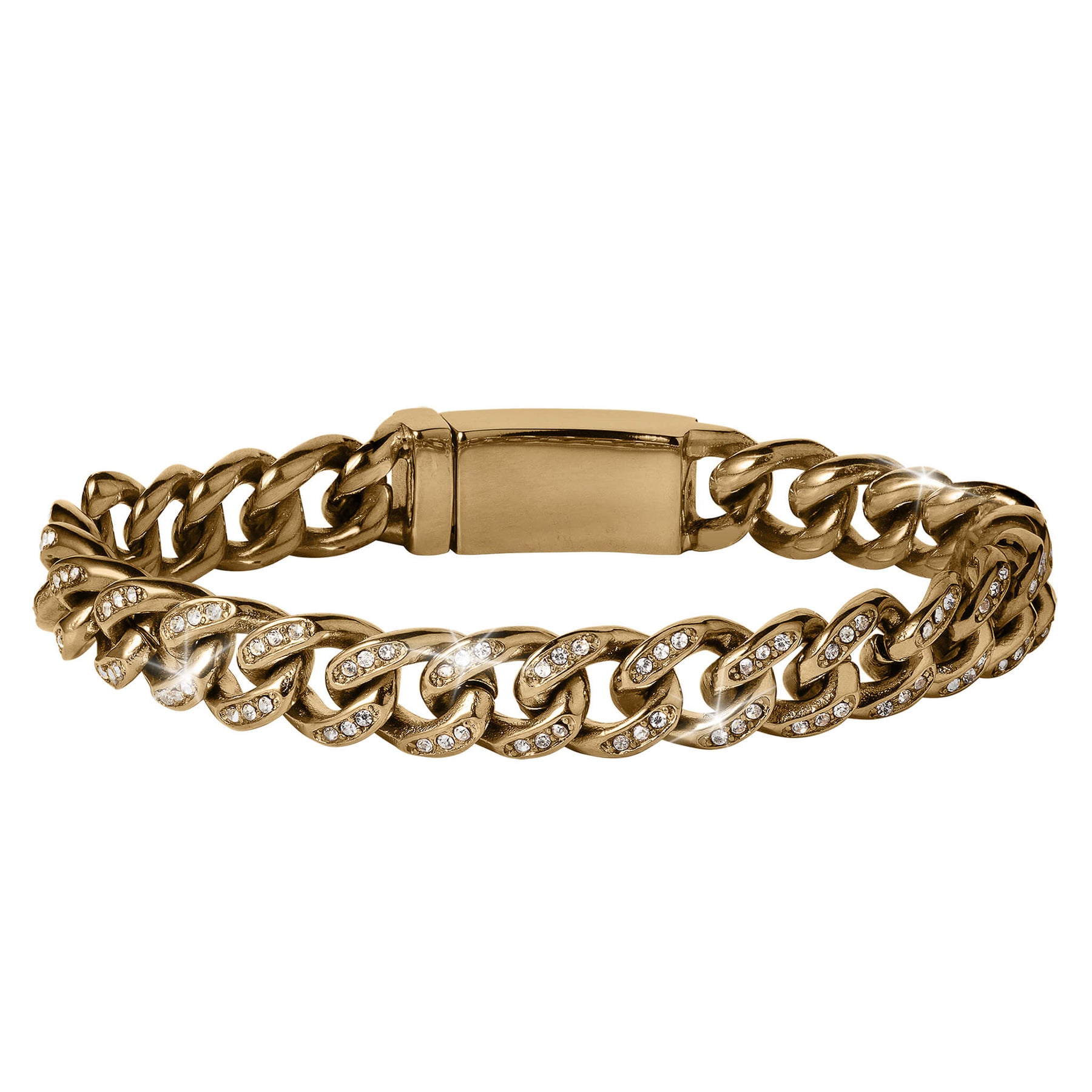 A timeless stylish design sure to add sophistication to any outfit. Finely crafted from stainless steel finished in yellow gold. The classic curb link is a timeless and versatile style that can be worn alone or layered with other bracelets to create a unique look. Ice white Diamondeau®, flawless simulated diamond, have been strategically set along the length of the bracelet and set into the clasp which completes the look. A truly standout piece.