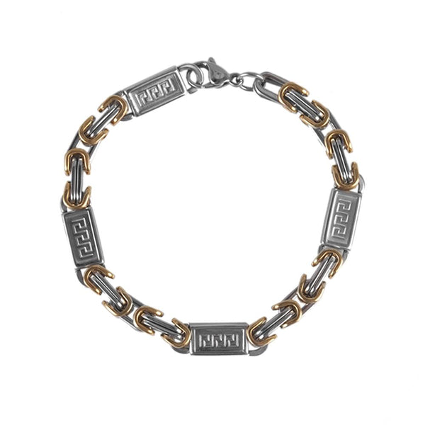 The meander pattern, Greek key pattern or even Greek Lines as it is usually known in Italy, features in many of the traditional Greek art. Whatever name you wish to call it, it is a classic must-have, an absolute all year round winner and we couldn't be more happy to bring you a definitive set, made of the best premium grade 316L solid Stainless Steel. Featuring this unpretentious pattern in its links, and an 18k Yellow Gold plating in its connecting sections.
