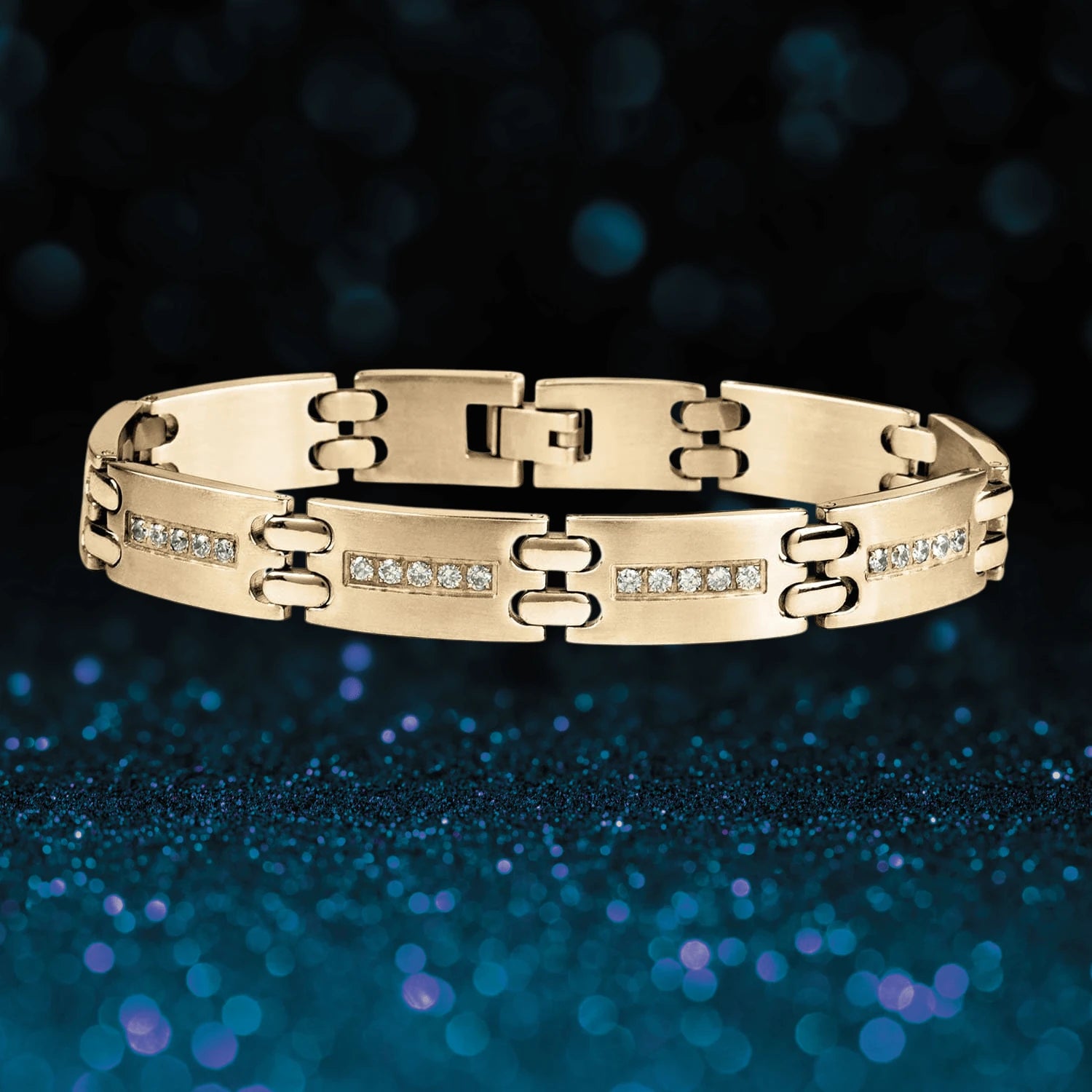 This bold style with a hint of sparkle is just his style. Crafted from premium stainless steel lavishly plated with 18k yellow gold, the bracelet features 1.20ct glistening Diamondeau® - flawless simulated diamond. A smart look for the boardroom or the gym. A ring in complimenting style completes the look; inlayed with cable inserts and 16 stunning Diamondeau® - flawless simulated diamond. A great anytime look.