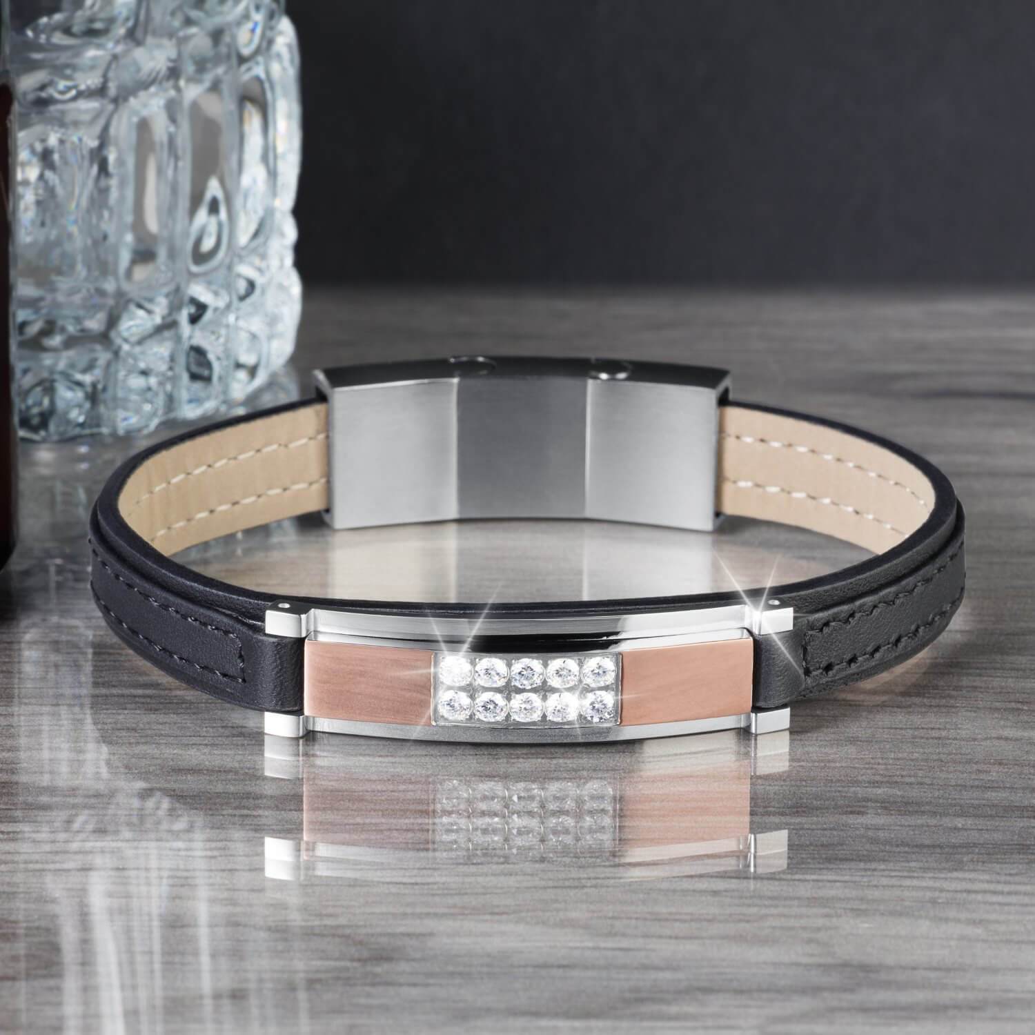 Premium grade stainless steel is the starting point for our outstanding new bracelets. The stylish bracelet features an ingenious new fastening; which makes the bracelet adjustable. Stylish stitched leather bands with an ID plate at the centre set with 10 of our glistening Diamondeau® - flawless simulated diamond gems to complete this luxurious look. Available in a choice of finish, mocha brown leather, finished with 18k rose gold. Black leather, finished with midnight black details. All making it the perfect balance of casual yet premium wear. A perfect gift.