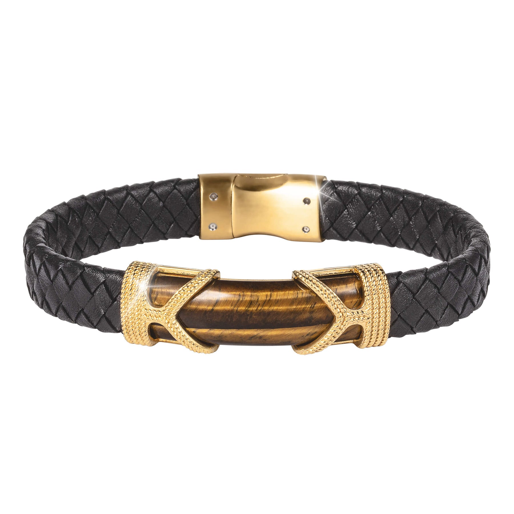 Unleash your inner strength with this striking men’s bracelet, the power of nature meets refined design. A meticulously woven black leather band forms the foundation of this bold piece, offering both flexibility and durability for everyday wear. A captivating Tiger’s Eye stone, renowned for its protection and grounding properties, is held in an embrace of gold plated stainless steel. Make a compelling statement.