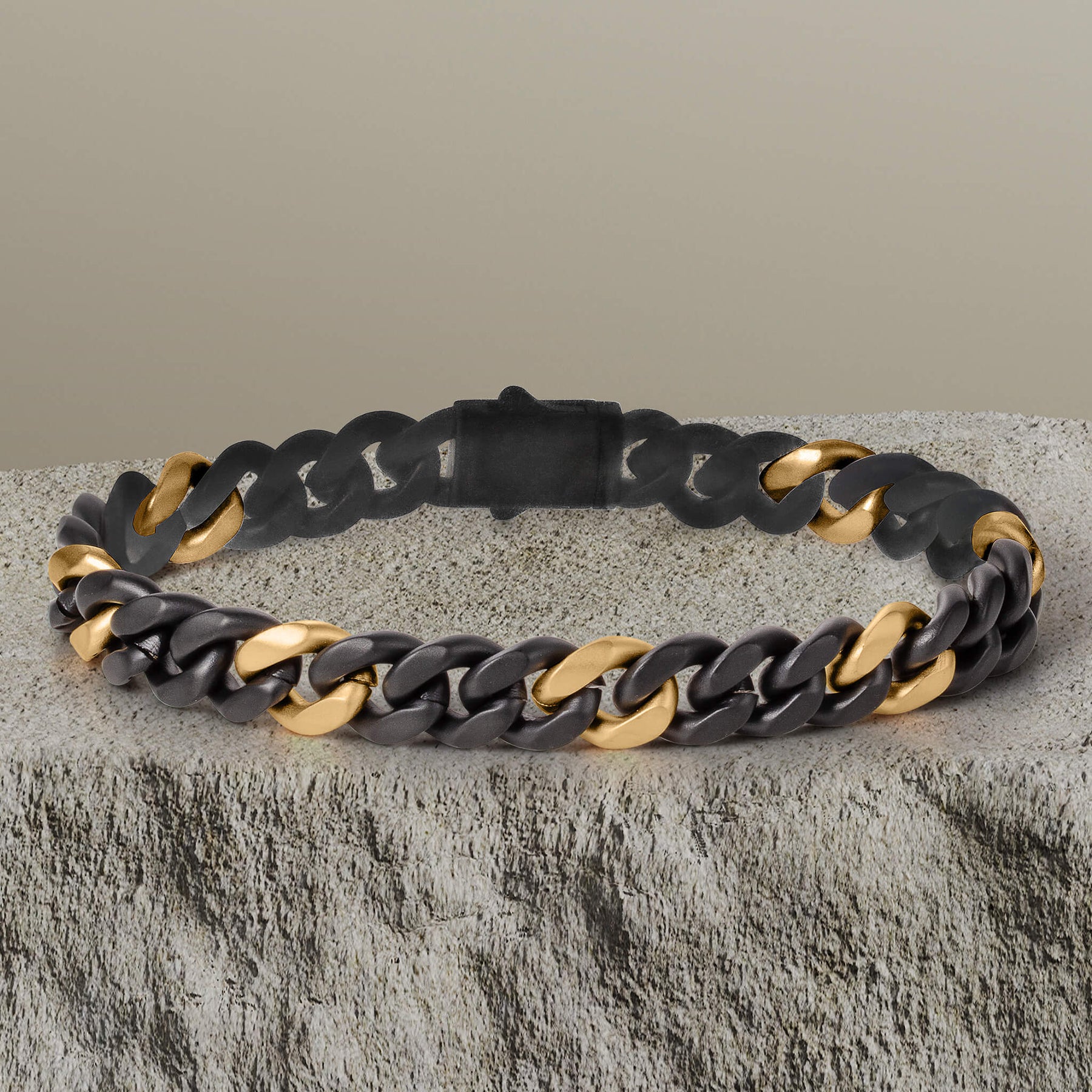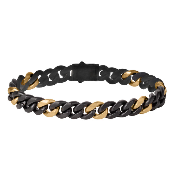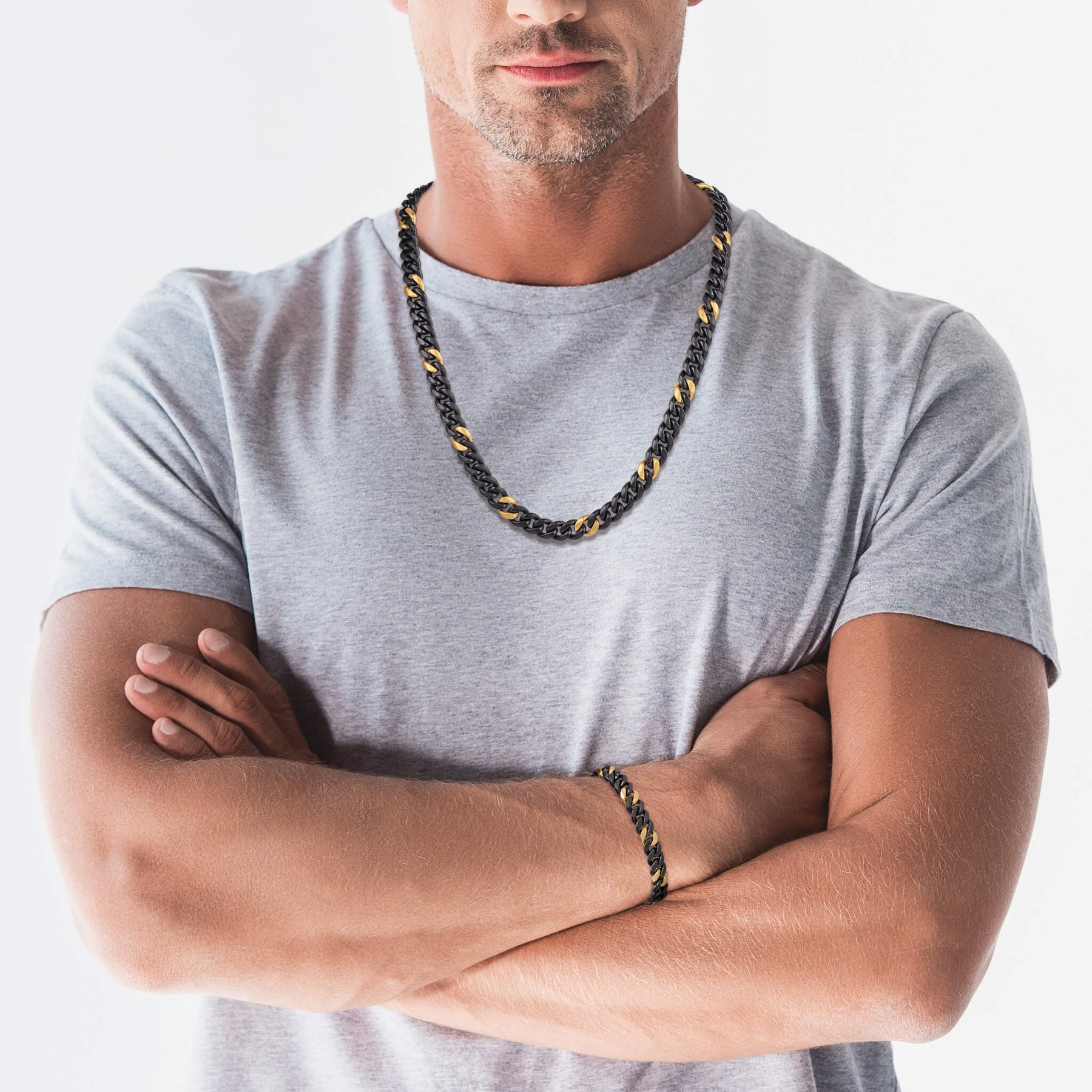 Elevate your style with this classic Cuban chain bracelet, meticulously crafted from premium grade stainless steel. This piece combines durability with timeless elegance. The two tone matt black and gold finish offers a bold yet sophisticated look, perfect for both casual and formal occasions. Whether you’re making a statement or adding a finishing touch to your outfit, this bracelet delivers unmatched style and versatility.