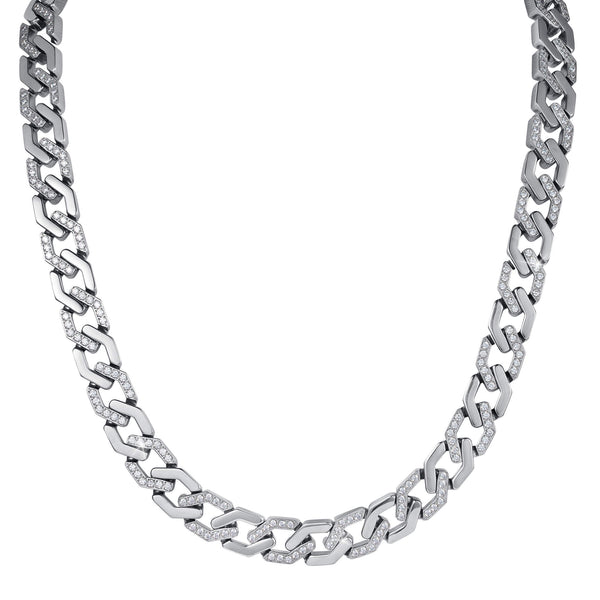 A necklace that redefines luxury with its exquisite design. This meticulously crafted necklace is made from premium grade stainless steel that imparts a sleek, modern aesthetic that complements any ensemble. What sets these pieces apart are the alternating links adorned with ice white Diamondeau®, flawless simulated diamond, adding a touch of opulence and brilliance to the ensemble. Whether you’re dressing up for a special occasion or simply looking to make a statement in your everyday style, this steel men's necklace is the perfect choice.