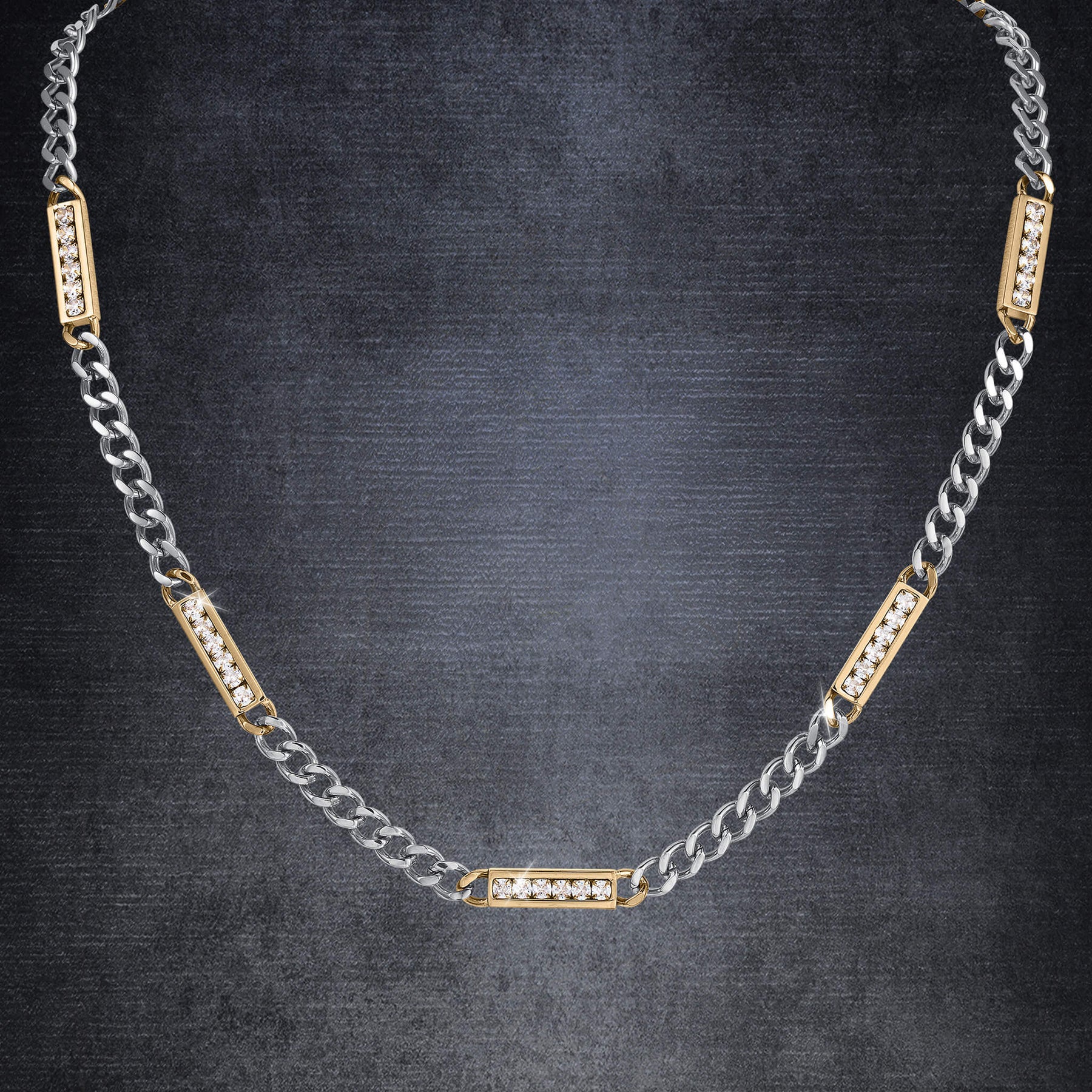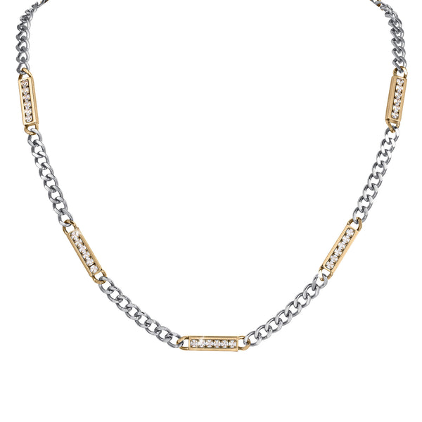 Take your style to new heights. A stainless steel classic curb chain is complemented by golden stations. Each station is adorned with 6, ice white Diamondeau®, flawless simulated diamond, adding brilliance to the design. The contrast between the stainless steel and golden accents creates a striking visual impact, making this necklace a standout addition to any ensemble.